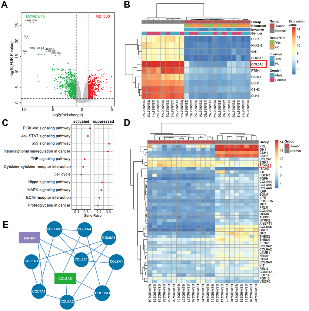 According to the above criteria, we finally chose 9 normal pituitary and 14 PA samples (GSE26966) for our re-analysis by Affymetrix Human Genome U133 Plus 2.0 Array. The results showed that the top 10 significantly downregulated genes (CSH1, CSH2, DLK1, NKX2-2, CSHL1, PTEN, POU1F1, COL6A6, GH1, and PCK1) associated with tumor metastasis were labeled in Figure 1A, 1B. Meanwhile, the expression of COL6A6 in PA tissues was the lowest (Figure 1B). Besides, the dotplot of GSEA showed that PI3K-Akt signaling pathway was notably activated in all comparisons (Figure 1C), and most of the genes associated with the PI3K-Akt pathway were downregulated (Figure 1D). Of note, P4HA3 acts as an upstream regulator gene of the PI3K-Akt pathway, was upregulated in PA tissues compared with the normal group (Figure 1D). Furthermore, COL6A6 was found to be closely related to P4HA3 in the networks of differentially expressed genes (Figure 1E).