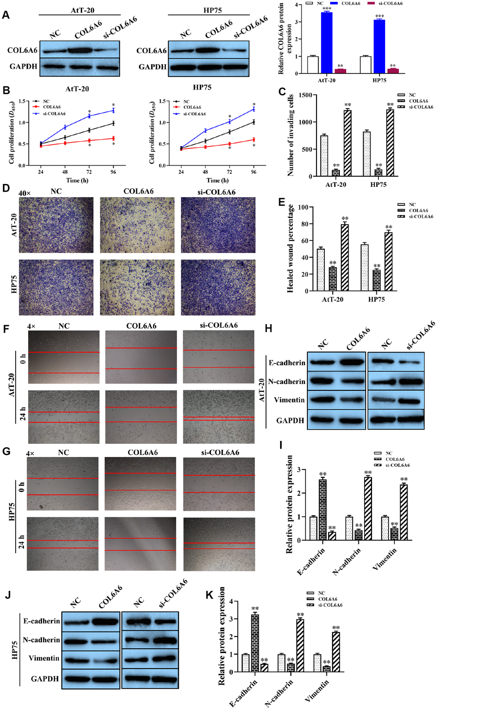 To explore the effect of COL6A6 on the proliferation, invasion, migration, and apoptosis of AtT-20 and HP75 cells. Western blotting analysis results showed that the expression level of COL6A6 protein was increased or decreased in AtT-20 and HP75 cells when transferred with pcDNA-COL6A6 (both P<0.001) or si-COL6A6 (both P<0.01) compared with the NC group (Figure 3A). CCK-8 analysis results showed that overexpression of COL6A6 notably inhibited the proliferation ability of both AtT-20 and HP75 cells compared with the NC group (both P<0.05, Figure 3B). Besides, the effect of COL6A6 knockdown on the proliferation of both AtT-20 and HP75 cells were detected (both P<0.05, Figure 3B). Transwell and wound healing assay demonstrated that upregulation of COL6A6 remarkably inhibited invasion and migration capacity of both AtT-20 and HP75 cells (all P<0.01, Figure 3C–3G). Conversely, knockdown of COL6A6 promoted the invasion and migration of both At T-20 and HP75 cells (all P<0.01, Figure 3C–3G). Western blotting showed that COL6A6 elevated significantly suppressed the expression levels of N-cadherin and Vimentin proteins in AtT-20 and HP75 cells compared with NC group (all P<0.01, Figure 3H–3K), but enhanced the E-cadherin protein (all P<0.01, Figure 3H–3K). However, silencing of COL6A6 got opposite results (all P<0.01, Figure 3H–3K). These results strongly implied that overexpression of COL6A6 was suppressed the proliferation, invasion, migration, and EMT of AtT-20 and HP75 cells.