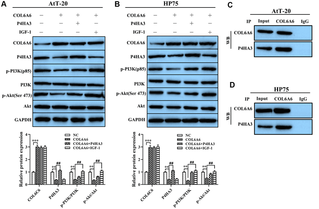 To further clarify the mechanism of COL6A6 regulated the growth and metastasis of PA cells, we assessed the effect of COL6A6 interacted with P4HA3 on the PI3K-Akt pathway, which plays an important role in regulating tumor development, tumor cells invasion and EMT. Western blotting showed that COL6A6-elevated significantly decreased the expression of P4HA3 protein, as well as decreased the expression of p-PI3K and p-Akt, but the expression of PI3K and Akt remained unchanged (all P<0.01, Figure 5A, 5B). In addition, we further detected the expression p-PI3K and p-Akt in both AtT-20 and HP75 cells treated with the PI3K-Akt pathway activator (IGF-1) or P4HA3 overexpression, the results showed that P4HA3 upregulation or IGF-1 treatment abolished the inhibitory effect of COL6A6-elevated on the PI3K-Akt pathway (all P<0.01, Figure 5A, 5B). Furthermore, co-immunoprecipitation showed that COL6A6 was closely related to P4HA3 (Figure 5C, 5D). These data indicated that COL6A6 may serve an anti-oncogene role in the development of PA by interacting with P4HA3 and further blocking the PI3K-Akt pathway, while its mechanism needs further verification.