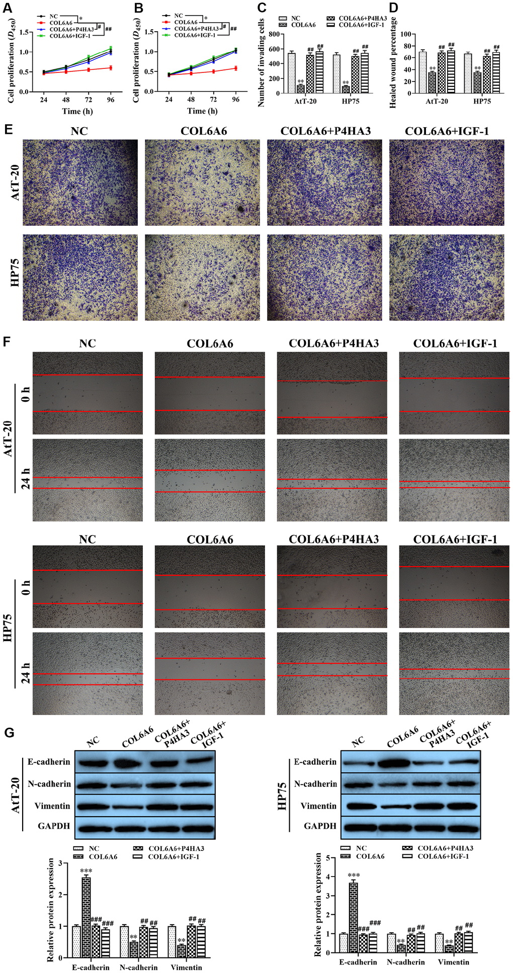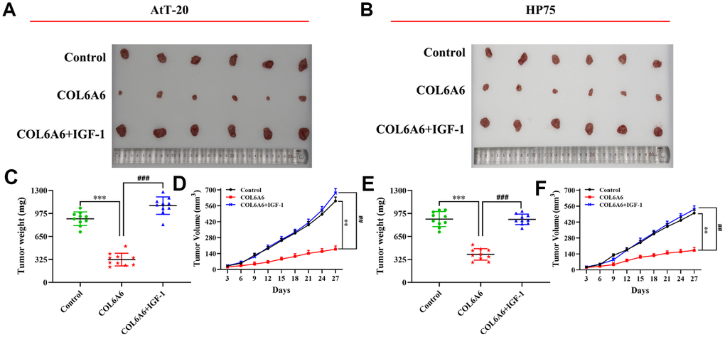 Based on the effect of COL6A6 on the PI3K-Akt signaling pathway by interacting with P4HA3 in vitro, to further explore the role of COL6A6 and P4HA3 mediated the proliferation, invasion, migration, and apoptosis of both AtT-20 and HP75 cells by regulating PI3K-Akt pathway. CCK-8, Transwell and wound healing assay demonstrated that P4HA3 overexpression or IGF-1 treatment significantly abolished upregulation of COL6A6 exerted antitumor activity in both AtT-20 and HP75 cells (Pproliferation<0.05, Pinvasion<0.01, Pmigration<0.01, Figure 6A–6F). Besides, we found that IGF-1 addition or P4HA3-elevated reversed the inhibitory effect of COL6A6 on the EMT of both AtT-20 and HP75 cells (all P<0.001, Figure 6G). Furthermore, we observed that overexpression of COL6A6 significantly decreased the size of the tumor compared with the control group (all P<0.001, Figure 7A, 7B), while the size of the tumor with IGF-1 treatment was bigger than the COL6A6 overexpression group (all P<0.001). Meanwhile, IGF-1 rescued the antitumor activity of COL6A6 in subcutaneous xenograft models (Figure 7C–7F). Taken together, these data suggested COL6A6 elevated inhibited tumor growth and metastasis in PA via interacting with P4HA3 and blocking the PI3K-Akt pathway.