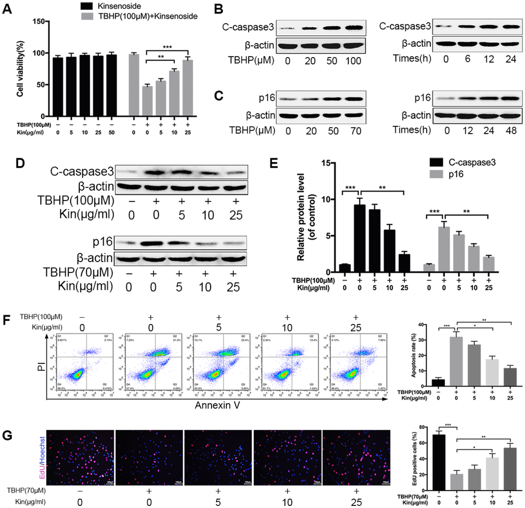 In this study, we used TBHP to induce oxidative stress, which is a common pathomechanism of NPC apoptosis and senescence [14]. To test the effect of Kin on NPCs viability, we treated NPCs with different concentrations of Kin for 24 h. The CCK-8 results showed that Kin treatment displayed no cytotoxicity in the NPCs and was able to rescue the impaired cell viability under oxidative stress in a dose-dependent manner (Figure 1A). Moreover, the western blotting results showed that Kin could inhibit the protein levels of cleaved-caspase3 (C-caspase3, a protein marker of apoptosis) and p16 (a protein marker of senescence) that were increased by TBHP (Figure 1B–1E). And this anti-apoptotic effect of Kin was further confirmed by the Annexin V-APC/PI staining using flow cytometry (Figure 1F). In addition, the NPC proliferation was determined by EdU staining, which was less positive in senescent cells. As shown in Figure 1G, Kin significantly rescued the capacity of proliferation. Together, these data suggest that Kin could suppress NPC apoptosis and senescence under oxidative stress.