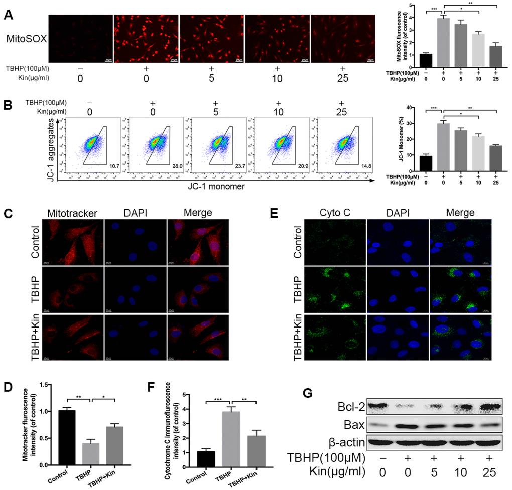 Mitochondrial dysfunction is involved in the pathogenesis of IDD [14]. When confronting with oxidative stress, mitochondrion is the primary target attacked by ROS, and also produces excessive amounts of ROS due to the damage to enzymes in the electron transport chain [14, 27]. Therefore, we first evaluated the mitochondrial ROS by MitoSOX staining and quantified the fluorescence intensity. The results showed that mitochondrial ROS was markedly increased in TBHP-stimulated NPCs but decreased when the NPCs were pretreated with Kin (Figure 2A). Based on this finding, we wondered if Kin could maintain the mitochondrial membrane potential (MMP), which would be reduced by inner mitochondrial membrane permeabilization. The JC-1 staining and flow cytometry analysis showed that the loss of MMP induced by TBHP was prevented by the administration of Kin in a dose-dependent manner. (Figure 2B). This protective effect on the MMP was further confirmed by the membrane potential-dependent mitochondria staining assay. Pretreatment with Kin significantly increased the fluorescence intensity compared to the NPCs treated with TBHP alone (Figure 2C, 2D). Following the enhanced permeability of mitochondrial membrane, the Cytochrome C (Cyto C), a pro-apoptotic protein that mainly exists in mitochondria, would release into the cytoplasm, contributing to the caspase activation and the apoptotic occurrence. Thus, we determined the cellular localization of Cyto C by immunofluorescence, and we found that Kin inhibited the release of Cyto C under oxidative stress (Figure 2E, 2F). In addition, we also detected the levels of Bcl-2 and Bax, the proteins that activate the outer mitochondrial membrane permeabilization and the mitochondrial apoptotic pathway. The results showed that Kin treatment increased the level of Bcl-2 (an anti-apoptotic protein) but decreased the level of Bax (a pro-apoptotic protein) under oxidative stress (Figure 2G). Collectively, the above data suggest that Kin attenuates TBHP-induced mitochondrial dysfunction in NPCs.