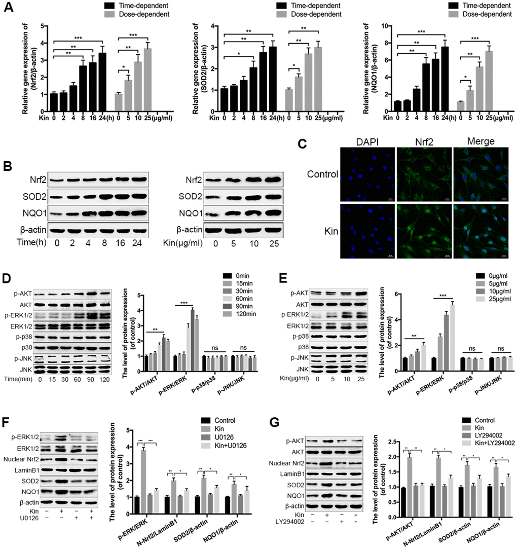 In view of the antioxidant capacity of Kin, we speculated that Kin could activate the transcription factor Nrf2 and its downstream target genes, endowing NPCs with oxidative stress resistance. To verify this hypothesis, we first measured the expression of Nrf2 and downstream antioxidant enzymes by real-time PCR assay. As shown in Figure 3A, Kin significantly increased the expression of Nrf2 and Nrf2-dependent genes at the mRNA level in a time- and dose-dependent manner. These results were consistent with the western blotting analyses (Figure 3B). In addition, using confocal microscopy, the Nrf2 immunofluorescence in the Kin-treated NPCs exhibited an obvious nuclear translocation of Nrf2 compared to the control group (Figure 3C), indicating the activation of Nrf2. Moreover, to further explored the underlying molecular mechanism of Kin-mediated Nrf2 activation, we also investigated the roles of AKT and MAPK signaling pathways in the regulation of Nrf2 [28]. As shown in Figure 3D, 3E, Kin induced the phosphorylation of upstream kinases, including AKT and ERK1/2, in a time- and dose-dependent manner within 2 h, but without influences on the levels of p-p38 and p-JNK as well as the total protein levels of AKT, ERK1/2, p38 and JNK, suggesting that Kin probably activated Nrf2 through the phosphorylation of AKT and ERK1/2 in NPCs. Therefore, we subsequently applied the U0126 (an ERK1/2 inhibitor) and LY294002 (a PI3K inhibitor) to reduce the activities of these two kinases. The western blotting results showed that pretreatment with LY294002 and U0126 blocked the phosphorylation of AKT and ERK1/2 respectively, and also attenuated the nuclear translocation of Nrf2 in the Kin-treated NPCs (Figure 3F, 3G). Meanwhile, the Kin-induced upregulation of SOD2 and NQO1 was partially suppressed by the pharmacological inhibition of AKT and ERK1/2 respectively (Figure 3F, 3G). Together, the above data indicate that Kin activates Nrf2 through the AKT and ERK1/2 signaling pathways in NPCs.