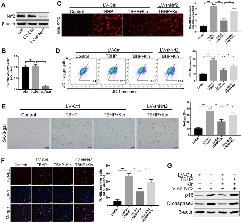 Based on the above findings, we hypothesized that the Kin-mediated cytoprotection in the TBHP-treated NPCs depended on the activation of Nrf2. Thus, we used the lentivirus vector to downregulate the expression of Nrf2 in NPCs before treatments. The transfection efficiency of Nrf2 knockdown was determined by western blotting (Figure 4A, 4B). Then, we measured the mitochondria-derived ROS via MitoSOX staining. The results showed that Nrf2 knockdown diminished the ROS scavenging capacity of Kin under oxidative stress (Figure 4C). In addition, the JC-1 staining analyzed by flow cytometry also indicated that the genetic depletion of Nrf2 could attenuate the protective effect of Kin on the MMP under such condition (Figure 4D). Next, by the SA-β-gal staining assay, we found that the number of senescent NPCs was increased by TBHP, while reduced by Kin via Nrf2 activation (Figure 4E). Meanwhile, the apoptosis evaluation using TUNEL assay coincided with our observations in the senescence assessment (Figure 4F). These results were further confirmed by the changes in protein levels of p16 and C-caspase3 (Figure 4G). Together, the above data suggest that the beneficial effects of Kin on mitochondrial dysfunction, senescence and apoptosis are closely associated with Nrf2 activation in NPCs.
