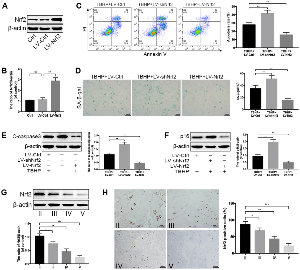 To further clarify the roles of Nrf2 in resisting oxidative stress, we detected the changes in cellular responses induced by TBHP when the expression of Nrf2 was downregulated (LV-shNrf2) or overexpressed (LV-Nrf2) via transfection with lentivirus. The transfection efficiency of Nrf2 overexpression was determined by western blotting (Figure 5A, 5B). Firstly, we quantified the apoptotic cells in treated-NPCs using Annexin-V/PI staining. The results showed that Nrf2 knockdown could increase the apoptosis rate in TBHP-treated NPCs, while LV-Nrf2 transfection could significantly alleviate NPC apoptosis (Figure 5C). The results were also confirmed by the level of C-caspase3 (Figure 5E). In addition, the SA-β-gal staining assay demonstrated that senescence of NPCs could be worsened by genetic ablation of Nrf2, but suppressed by Nrf2 overexpression under oxidative stress (Figure 5D). This finding was correspondingly verified by the western blotting of p16 (Figure 5F). Nrf2 is believed to maintain cellular homeostasis under stress, and its dysregulation has been considered as a key pathomechanism in chronic diseases [17]. However, the relationship between Nrf2 and IDD has not been investigated. Therefore, we collected the human NP tissues from patients with different grades of IDD. The protein level of Nrf2 in human NP samples was measured by western blotting and immunohistochemical staining. As displayed in Figure 5G, 5H, the level of Nrf2 was markedly decreased with the IDD grade. Therefore, the above data suggest that Nrf2 protects against apoptosis and senescence under oxidative stress in NPCs and the decreased Nrf2 protein level negatively correlates with the IDD grade.