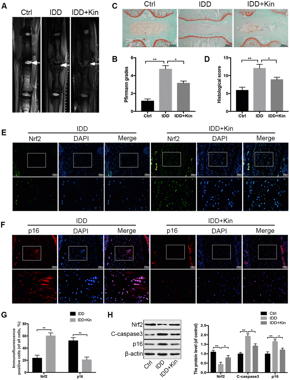 According to the results obtained from in vitro experiments, we wondered whether Kin could be a therapeutic agent for the treatment of IDD in vivo. Then we constructed the IDD model by puncturing caudal discs of rats. The MRI examination was first applied to assess the IDD grade at 4 weeks after surgery. As shown in Figure 6A, there was an obvious loss of T2-weighted signal in punctured discs of the IDD group, which represented the disc degeneration, while the administration of Kin could partly improve the MRI signal intensity. Similarly, the Pfirrmann grades, which also indicate the IDD extent based on the magnetic resonance images, were significantly lower in the Kin-treated group than those in the IDD group (Figure 6B). In addition, the IVD specimens collected from IDD models were subjected to Safranin O/fast green staining and evaluated by the histological score based on the morphology of discs. As seen in Figure 6C, the normal IVD contained a well-organized AF layer and an oval-shaped NP that was rich in proteoglycan and glycosaminoglycan. However, after the surgery, degenerative changes occurred in the IVD, which was characterized by the collapsed disc height, loss of matrix, disorganized AF layer, disappeared boundary between AF and NP, as well as hypocellular fibrocartilaginous tissue found in the NP area (Figure 6C). However, to a certain extent, these pathological features were alleviated by Kin administration, as demonstrated by the better-preserved structure of IVD in the Kin-treated group (Figure 6C). Meanwhile, the histological score was significantly lower in the IDD+Kin group than that in the IDD group, further confirming that Kin could ameliorate the puncture-induced IDD (Figure 6D). Subsequently, we measured the expression of Nrf2 and p16 in the rat NP by immunohistofluorescence and corresponding quantification. The results revealed that Kin administration could induce the upregulation of Nrf2 and the downregulation of p16, comparing to the IDD group (Figure 6E–6G). Moreover, western blotting results showed that Kin treatment increased the level of Nrf2 and decreased the levels of C-caspase3 and p16 (Figure 6H), which further supported our findings in vitro. Taken together, the above data suggest that Kin promotes the expression of Nrf2 and ameliorates IDD in vivo.