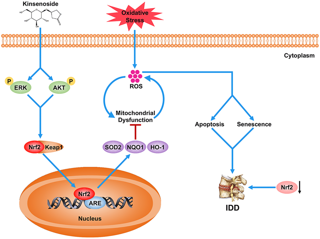 In this study, we demonstrated that Kin suppressed apoptosis, senescence and mitochondrial dysfunction in tert-butyl hydroperoxide (TBHP)-treated NPCs by activating the Nrf2, and alleviated IDD in a puncture-induced rat model. Further experiments revealed that Kin promotes the expression and activity of Nrf2 through the activation of AKT and ERK1/2. Importantly, we first established the relationship between Nrf2 and IDD, and elucidated the role of Nrf2 in NPCs under oxidative stress. These findings collectively shed light on the pathogenesis of IDD and provide a novel agonist of Nrf2 to IDD therapy, with evidence for the future clinical translational practice of Kin.