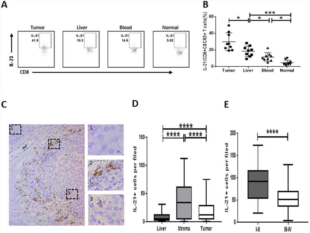 We investigated whether IL-21 was produced by CD8+CXCR5+ T cells in HCC. We found that numbers of IL-21-producing CD8+CXCR5+ T cells were significantly higher within HCC tumor tissue than in the matched blood and peritumoral liver tissue or in healthy blood samples (Figure 2A and 2B). We subsequently found that strong tumor infiltration by IL-21-producing CD8+CXCR5+ T cells led to the accumulation of IL-21+ cells within the peritumoral stroma and that this accumulation correlated negatively with the TNM staging of the patients (Figure 2C–2E).