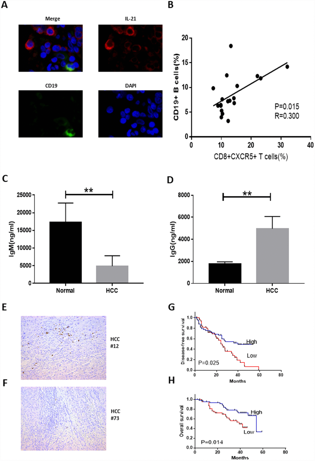 We demonstrated that large numbers of IL-21-producing CD8+CXCR5+ T cells accumulate within HCC tumor tissue. Because IL-21 plays a critical role in regulating immunoglobulin production [15, 16], we investigated the possible effects of tumor-infiltrating CD8+CXCR5+ T cells on B cells. Confocal microscopy showed that IL-21+ T cells and CD19+ B cells were located in the same region (Figure 4A). In HCC patients, moreover, there was a correlation between the frequencies of CD19+ B cells and CD8+CXCR5+ T cells (Figure 4B). These data demonstrate that immunoglobulin produced by B cells recruited by CD8+CXCR5+ T cells may play an important role in antitumor activity.