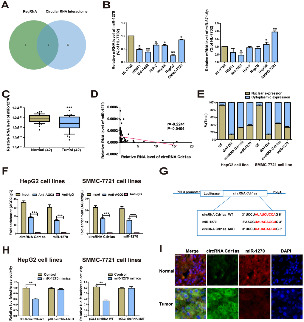 By extracting cytoplasmic and nuclear fractions of HCC cells, circRNA Cdr1as was identified to be mainly distributed in the cytoplasm, suggesting the possibility of circRNA Cdr1as to be a ceRNA. Through RIP, dual-luciferase reporter gene assay and FISH, it is confirmed that circRNA Cdr1as could sponge miR-1270 to upregulate AFP level. So far, relevant researches on the role of miR-1270 in HCC are rarely reported.