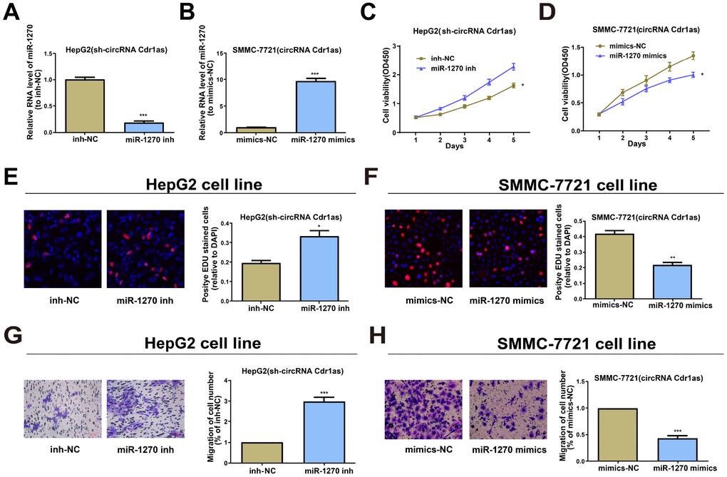 To ascertain that the role of circRNA Cdr1as required miR-1270 reduction in a direct manner, miR-1270 inhibitor was transfected into circRNA Cdr1as-repressed HepG2, and the observably reduced miR-1270 was discovered by qRT-PCR (Figure 3A). Meanwhile, miR-1270 mimics was transfected into circRNA Cdr1as-overexpressed SMMC-7721 cells, and the observably elevated miR-1270 was discovered by qRT-PCR (Figure 3B). A foregone conclusion was obtained from CCK8 and EDU assays that the proliferation capacities of circRNA Cdr1as-repressed HepG2 cells were promoted by miR-1270 suppression (Figure 3C and 3E). While, overexpressing miR-1270 was proved to evidently inhibit the proliferation capacities of circRNA Cdr1as-overexpressed SMMC-7721 cells (Figure 3D and 3F). The similar results were observed in cell migration assays (Figure 3G and 3H). The above discovery implies that miR-1270 participates in the carcinogenic process regulated by circRNA Cdr1as in HCC cells.