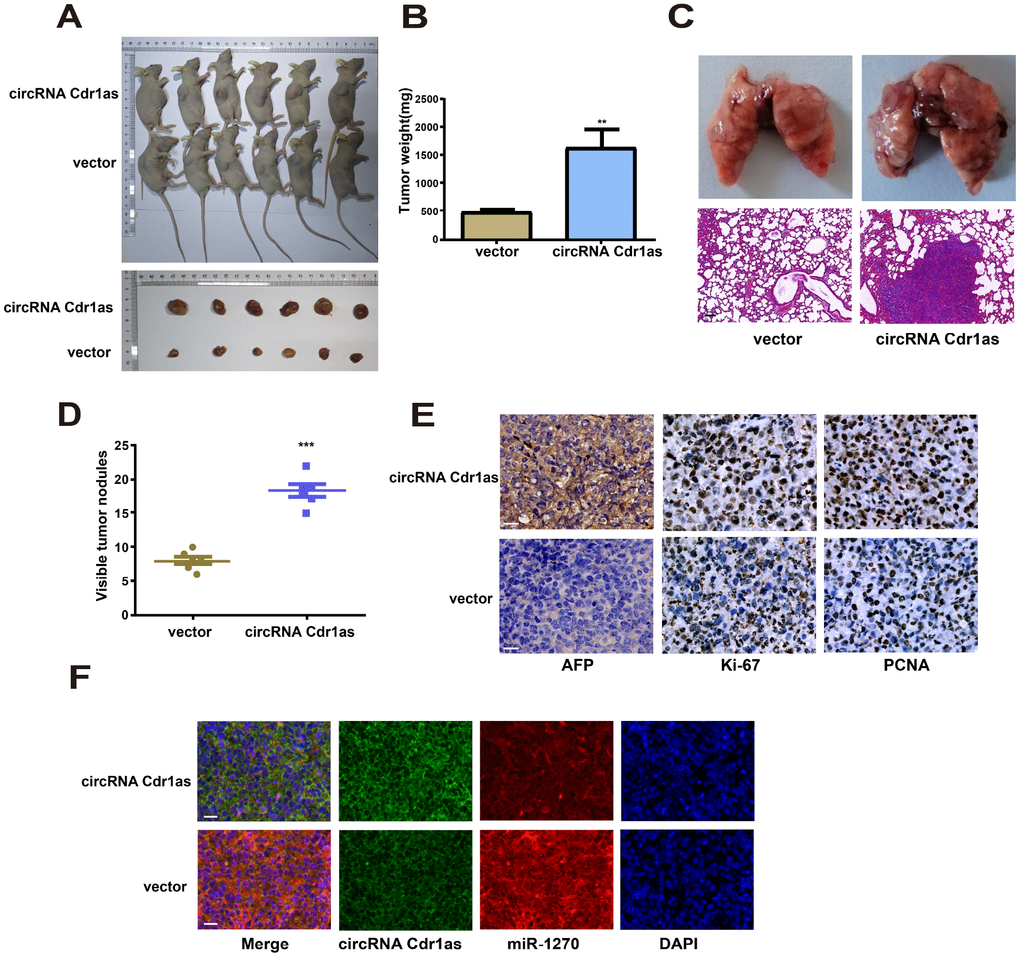 To investigate the role of circRNA Cdr1as in the in vivo growth of HCC, nude mice were subcutaneously injected with SMMC-7721 cells transfected with circRNA Cdr1as overexpression vector or NC vector. Four weeks later, tumor volume (Figure 6A) and tumor weight (Figure 6B) markedly increased in mice injected with SMMC-7721 cells with circRNA Cdr1as overexpression. To assess the effects of circRNA Cdr1as on the metastasis of HCC in vivo, circRNA Cdr1as overexpression SMMC-7721 cells or NC SMMC-7721 cells were injected via the tail vein into nude mice. Four weeks later, we found that the number and size of metastatic colonies were largely increased on the lung surface in the circRNA Cdr1as overexpression group. (Figure 6C and 6D). Positive expressions of AFP, Ki-67 and PCNA were detected by immunohistochemistry in tumor tissues, which were markedly upregulated by circRNA Cdr1as overexpression (Figure 6E).