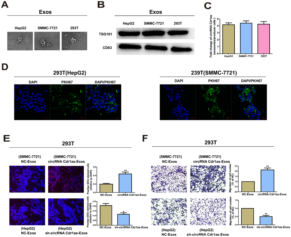We explored the existing pattern of extracellular circRNA Cdr1as. Morphology of exosomes was confirmed by TEM (Figure 7A), and surface hallmarks (TSG101 and CD63) were identified by Western blot (Figure 7B). We then found that circRNA Cdr1as expression was remarkably higher in HepG2 and SMMC-7721 cells than in 293T cells (Supplementary Figure 2A). As expected, exosomal circRNA Cdr1as level remained higher in HepG2 and SMMC-7721 cells compared with 293T cells (Supplementary Figure 2B). The data revealed that circRNA Cdr1as level was enriched in exosomes with at least 4-fold higher to that of producer cells (Figure 7C). A green fluorescent marker, PKH67 was used to label exosomes derived from HepG2 and SMMC-7721 cells. After recipient cells (293T cells) were incubated with labeled exosomes derived from HepG2 and SMMC-7721 cells for 3 h, we observed the distribution of PKH67 in the cytoplasm of recipient cells (Figure 7D).