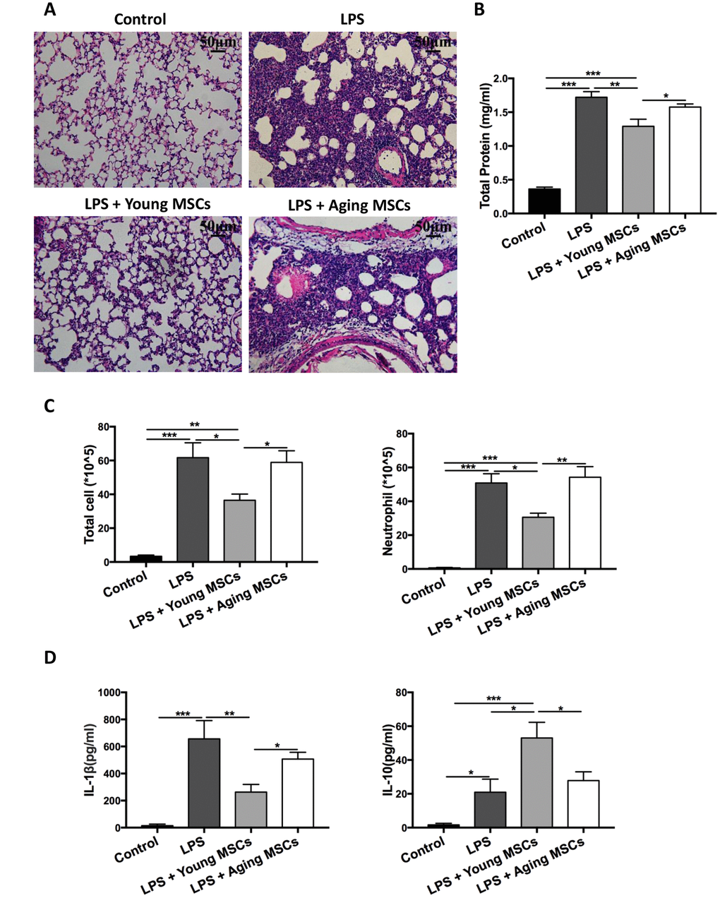In a mouse model of acute lung injury induced by endotoxemia, Bustos et al. showed that aging MSCs lacked the anti-inflammatory effects [21]. To mimic the human ARDS condition, acute lung injury was induced via intratracheal administration of LPS to young C57BL/6 mice (6~8 weeks old) and compared after administering young or aging MSCs. Lung histology at 48 h after LPS insult showed that adoptive transfer of young MSCs reduced the influx of inflammatory cells and thickening of alveolar septum compared with the LPS treatment, while aging MSCs lost the beneficial effects (Figure 1A). Compared with LPS-treated mice, young MSCs significantly decreased lung permeability, as reflected by reduced protein level in the bronchoalveolar lavage (BAL) at 48 h after LPS treatment, by 25.0% (Figure 1B). Young MSCs also reduced the number of total cells by 40.9% and neutrophils by 39.9% compared with LPS treatment (Figure 1C). In addition, young MSCs lowered proinflammatory cytokine IL-1β and elevated anti-inflammatory IL-10 (Figure 1D). In contrast, the anti-inflammatory effects of aging MSCs were significantly decreased compared with young counterparts (Figure 1B–1D).