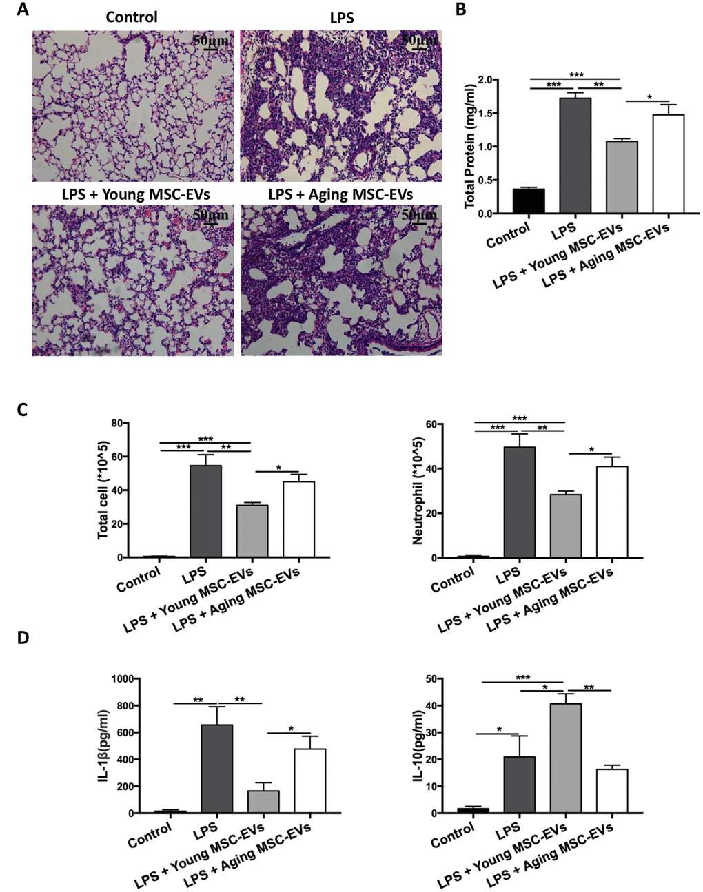 To determine whether aging and young MSC-EVs could mimic their parental cells in acute lung injury, aging and young MSC-EVs (100 μg in protein content) were administered intravenously to young mice with LPS-induced acute lung injury to compare their protective effects (control, LPS, LPS + young MSC-EVs, and LPS + aging MSC-EVs). In histology analysis, treatment of mice with young MSC-EVs reduced the inflammatory cell accumulation and alveolar septal thickness at 48 h post injury compared with the LPS group (Figure 3A). Compared with the LPS group, young MSC-EVs significantly reduced protein, total cells, and neutrophils (by 37.4%, 43.2%, 42.8%, respectively) in the BAL at 48 h (Figure 3B and 3C). Young MSC-EVs also reduced proinflammatory cytokine IL-1β and raised anti-inflammatory IL-10 in the BAL at 48 h (Figure 3D). Similar to their parental cells, aging MSC-EVs failed to display the beneficial effects in acute lung injury compared with young MSC-EVs.
