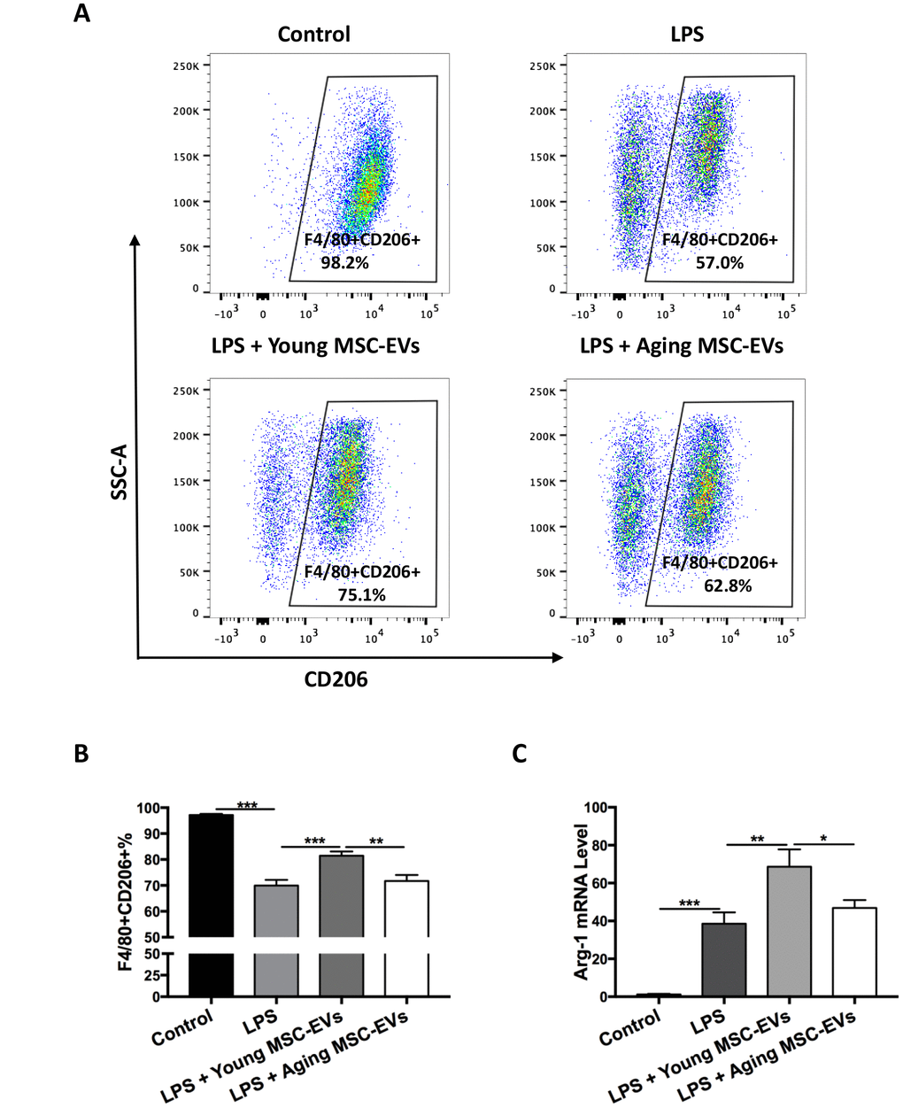 In order to study the effects of young and aging MSC-EVs on macrophage polarization, BAL were harvested from different groups of mice as described in the previous paragraph (control, LPS, LPS + young MSC-EVs, and LPS + aging MSC-EVs) at 24 h after LPS treatment. BAL was first analyzed phenotypically via flow cytometry. Flow cytometry analysis demonstrated that young MSC-EVs increased the expression of F4/80+CD206+ cells compared with the LPS group, favoring the orientation toward M2 macrophages, whereas aging MSC-EVs had a significantly diminished effect in M2 phenotype compared with young MSC-EVs (Figure 4A and 4B). Then, BAL macrophages were separated and analyzed for level of arginase-1 (Arg-1), a marker for M2 macrophages. Young MSC-EVs raised the mRNA level of Arg-1 in contrast to both LPS treatment and aging MSC-EVs (Figure 4C).