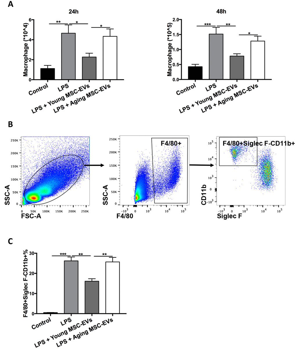 To study the effects of young and aging MSC-EVs on macrophage recruitment, BAL was harvested from the above experiment at 24 h and 48 h after LPS treatment and the number of F4/80+ macrophages were examined. Young MSC-EVs decreased the total macrophages in BAL compared with LPS group, while aging MSC-EVs did not produce such effect (Figure 5A). In order to further quantify recruited macrophages in BAL, cells were analyzed via flow cytometry. F4/80+Siglec F-CD11b+ cells were designated as recruited macrophages (Figure 5B) as described by Smith et al. [22]. At 24 h post injury, young MSC-EVs significantly reduced the percentage of recruited macrophages compared with LPS treatment, while aging MSC-EVs had no such effect (Figure 5C).
