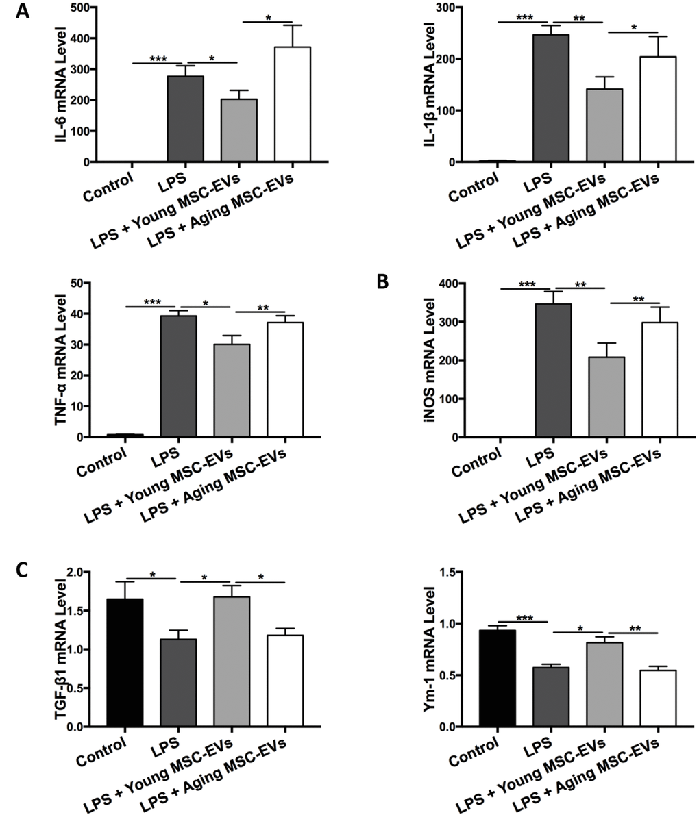 Mouse BMDMs were dissociated and reseeded on a 24-well plate at 3 × 105 cells per well. Cells were cultured alone or with young or aging MSC-EVs and simultaneously stimulated with LPS from Escherichia coli 055:B5 (Sigma, St. Louis, MO, 100 ng/mL). After 24 h, cells were collected for mRNA expression detection.