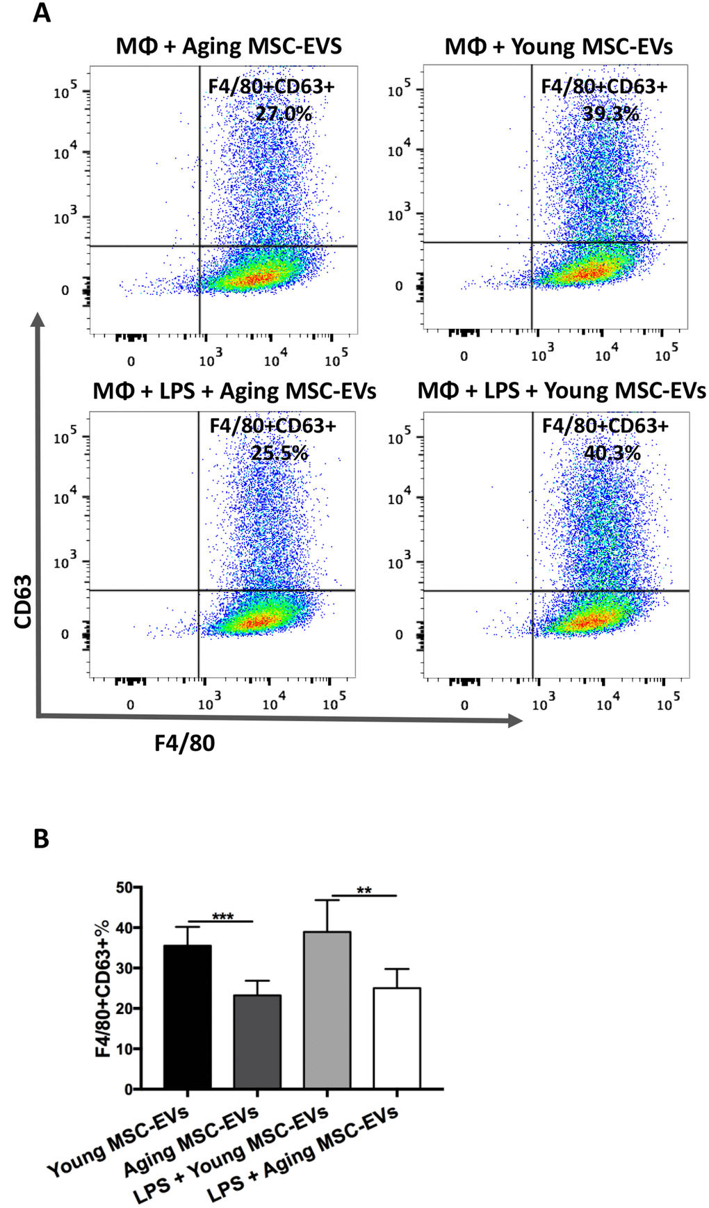 The uptake of protein and nucleic acids from EVs by target cells has been proposed as a novel mechanism of intercellular communication. Therefore, the uptake by macrophages was compared between aging and young MSC-EVs. EVs were labeled with CD63 and cultured with BMDMs for 6 h to examine internalization via flow cytometry. The percentage of macrophages with internalized EVs (F4/80+CD63+) was significantly lower in aging MSC-EVs group compared with young counterpart, indicating lower efficacy in internalization (Figure 7A and 7B). Furthermore, LPS stimulation did not alter the internalization by macrophages for both aging and young MSC-EVs (Figure 7A and 7B).