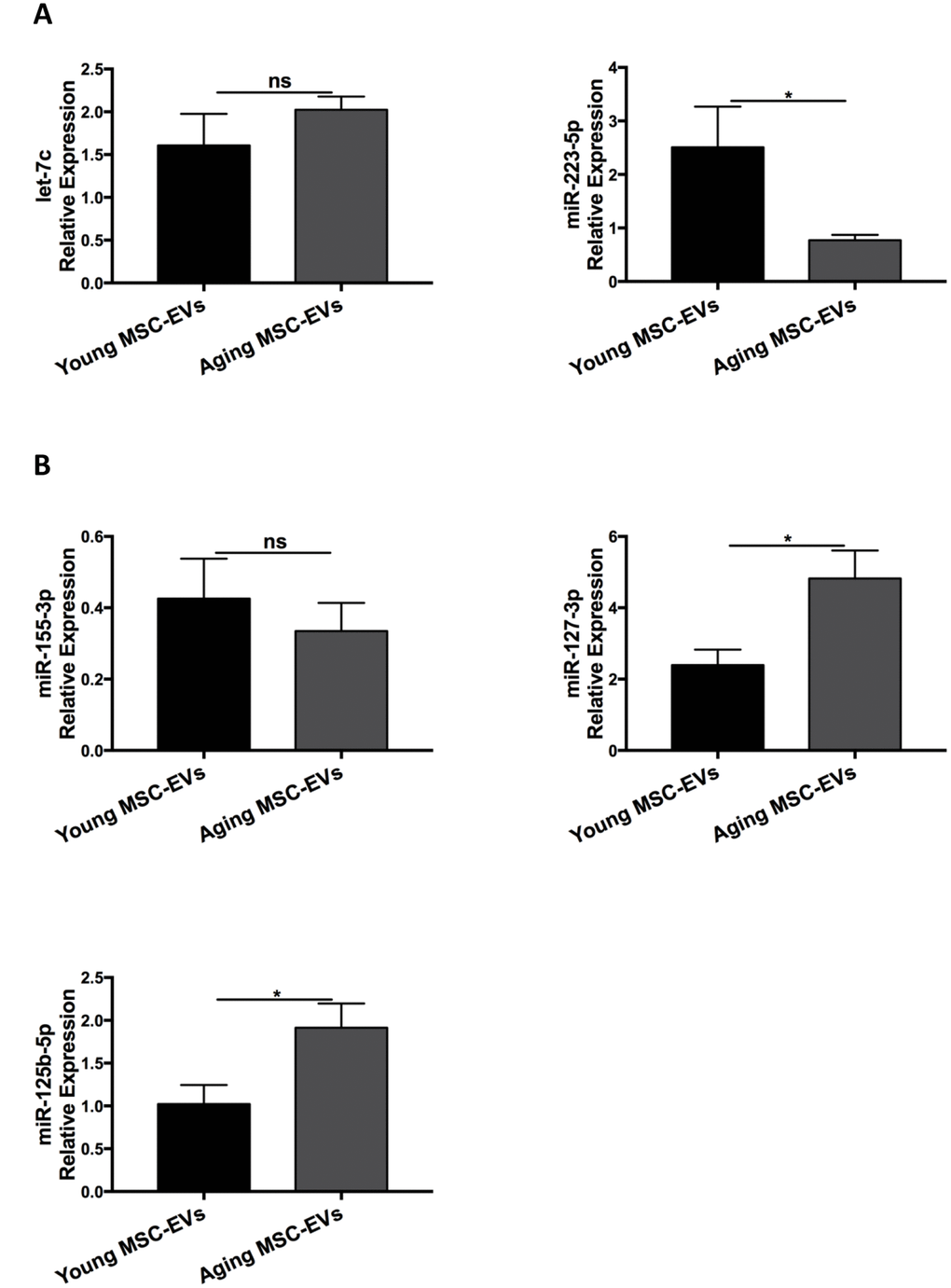 MSC-EVs play a role in intercellular communication via transfer of their contents, including mRNA, miRNA, and proteins. Several miRNAs have been reported to mediate M1 or M2 macrophage polarization. To explore the mechanism underlying the differential effects between young and aging MSC-EVs in macrophage polarization, MSC-EVs were examined for miRNAs associated with M2 polarization (let-7c, miR-223-5p) (Figure 8A) and M1 polarization (miR-155-3p, miR-127-3p, miR-125b-5p) (Figure 8B) via qRT-PCR. There was no significant difference in let-7c and miR-155-3p levels between young and aging MSC-EVs. Young MSC-EVs showed higher expression of miR-223-5p and lower levels of miR-127-3p and miR-125b-5p compared with aging MSC-EVs.