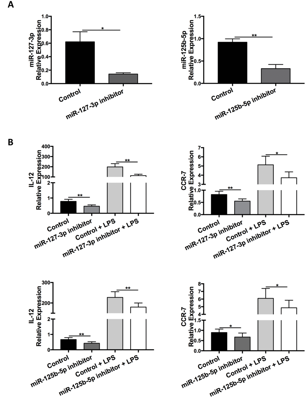miR-127-3p and miR-125b-5p levels after transfection were determined via qRT-PCR (Figure 9A). Transfection of miR-127-3p and miR-125b-5p inhibitors reduced the expression of M1 markers IL-12 and CCR-7 with or without LPS treatment (Figure 9B). On the other hand, BMDMs were transfected with miR-223-5p mimic and examined for macrophage polarization. However, miR-223-5p mimic did not affect the expression of M1 or M2 markers (data not shown).