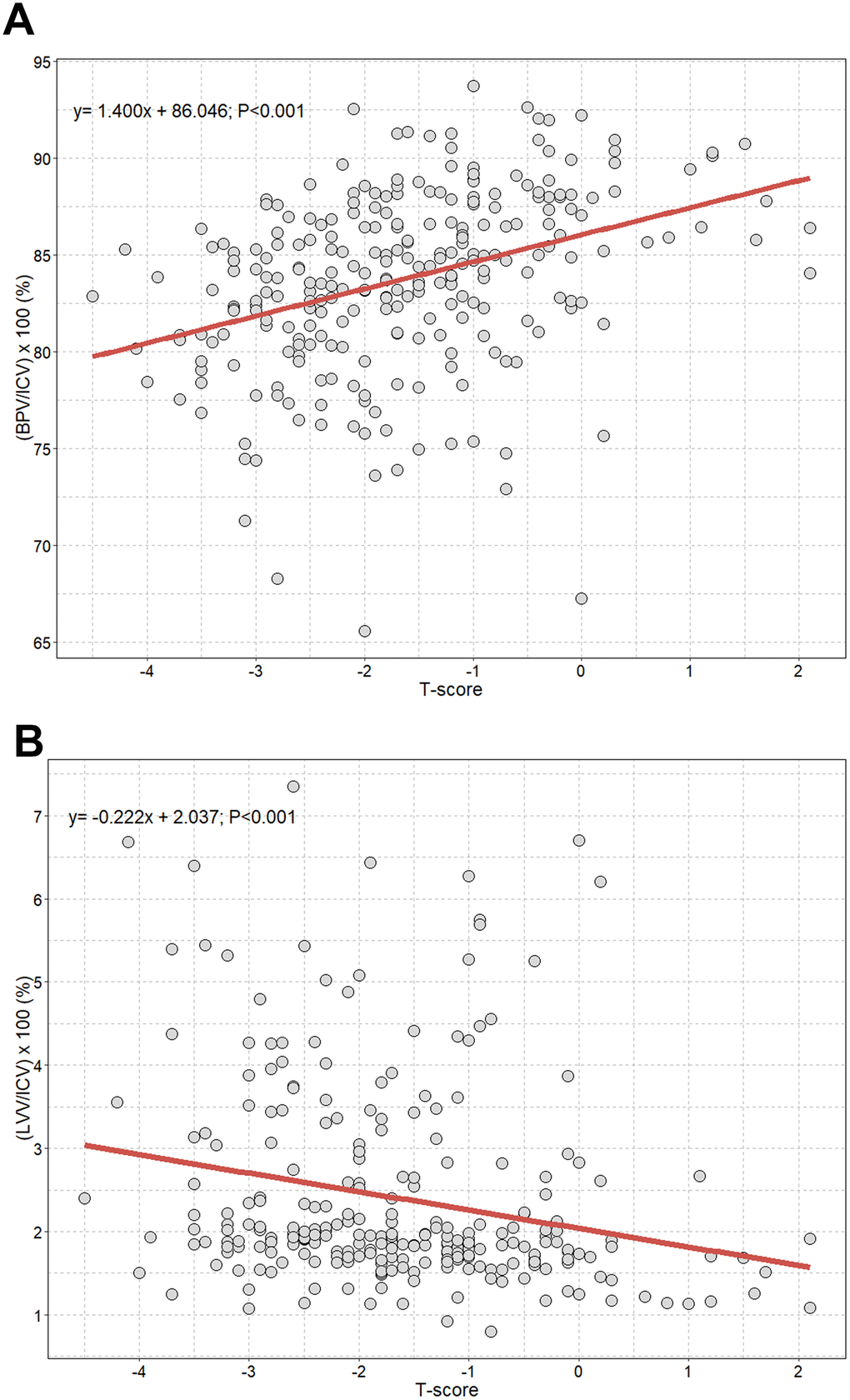 The intracranial cavity volume percentages of brain parenchyma and lateral ventricles were calculated as (BPV/ICV) × 100% and (LVV/ICV) × 100%, respectively. We constructed scatterplots with a regression line to represent the association between T-scores and the intracranial cavity volume percentages of brain parenchyma and lateral ventricles. Multivariable linear regression was also performed to identify independent associations between T-scores and the intracranial cavity volume percentages of the brain parenchyma and lateral ventricles. In addition to the T-score, covariates, including sex, age at the time of brain MRI (continuous variable), time interval between brain MRI and DXA (continuous variable), BMI (continuous variable), hypertension, diabetes, alcohol, and smoking were entered into the multivariable model.