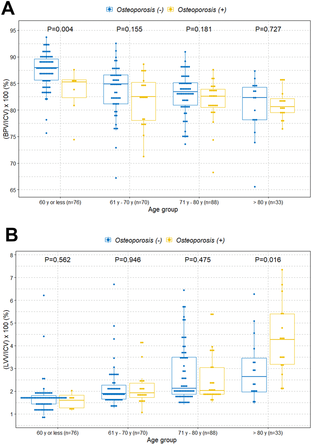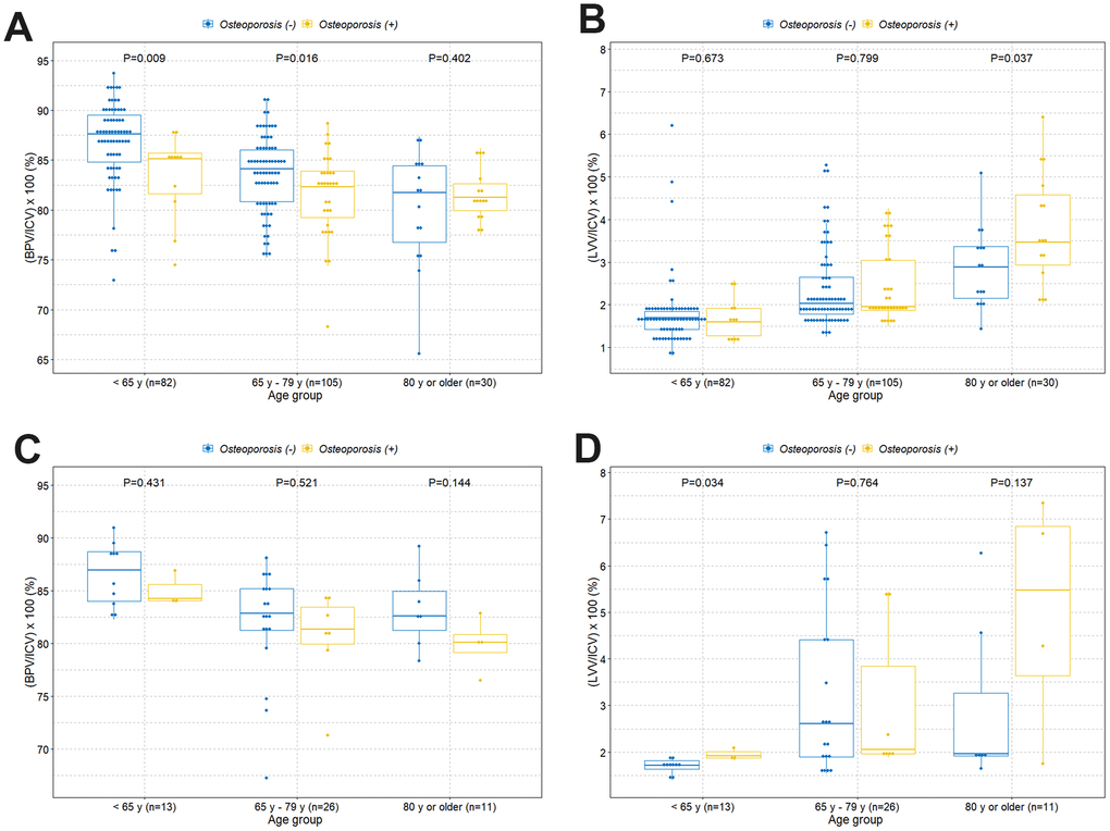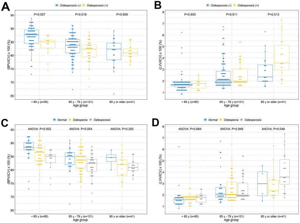 Box plots with dot plots were used to visualize the association between the intracranial cavity volume percentages of brain parenchyma and lateral ventricles, and age groups according to with or without osteoporosis. P-values less than 0.05 were considered statistically significant.