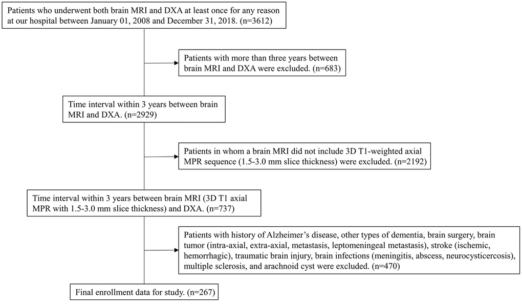 We retrospectively recruited individuals who underwent both brain MRI and DXA at least once for any reason in our hospital from January 1, 2008 to December 31, 2018. We initially identified 3,612 individuals whose records indicated one or more procedure codes for DXA and brain MRI simultaneously. In individuals who underwent DXA more than once, the lowest T-score from among the multiple DXA T-score values was considered. If multiple MRIs were performed, we considered that which was performed closest to the date of the DXA with the lowest T-score. We then excluded 3,345 individuals using stepwise methods for the following reasons: (1) more than 3 years elapsed between DXA and brain MRI (to reduce time heterogeneity) (n=683); (2) individuals in whom a brain MRI did not include T1-weighted axial multiplanar reconstruction (MPR) sequence (3-mm-thick slices) (n=2192); and (3) history of Alzheimer’s disease, other types of dementia, brain surgery, brain tumor (intra-axial, extra-axial, metastasis, leptomeningeal metastasis), stroke (ischemic, hemorrhagic), traumatic brain injury, brain infections (meningitis, abscess, neurocysticercosis), multiple sclerosis, and arachnoid cyst (n=470). Ultimately, we enrolled 267 individuals with no history of Alzheimer’s disease, other types of dementia, brain surgery, brain tumor, stroke, traumatic brain injury, brain infections, multiple sclerosis, or arachnoid cysts who underwent one or more DXA and brain MRI (included 3D T1-weighted multiplanar reconstruction (MPR) sequence), within 3 years of each other at our hospital over an 11-year period (Figure 5).