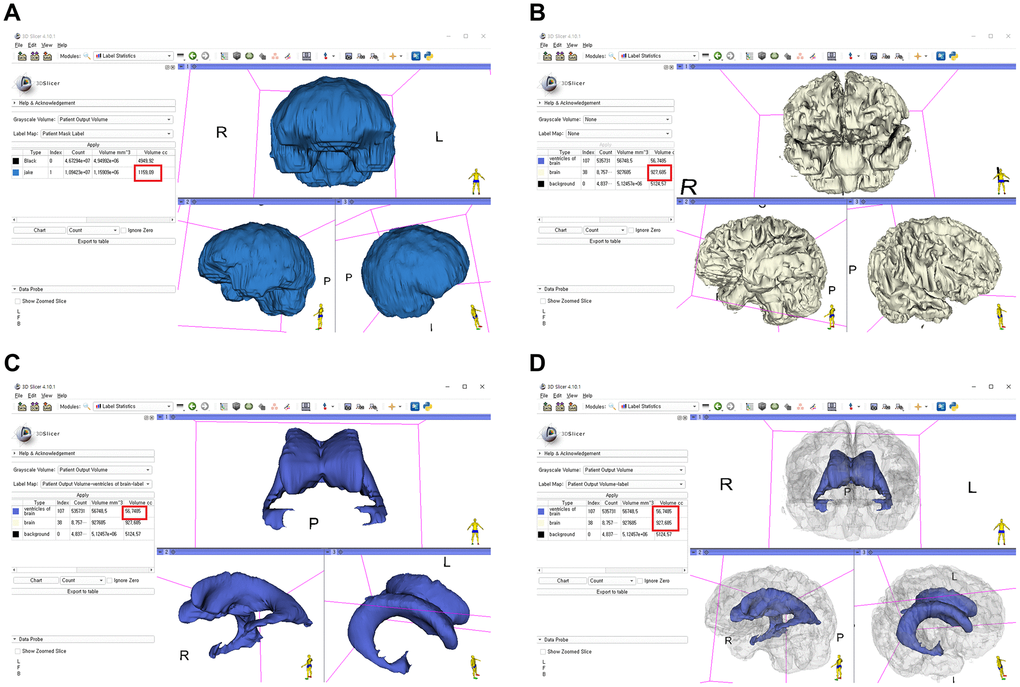 The stepwise methods of volumetric assessment using 3D slicer were as follows: (1) brain MRI DICOM files from the picture archiving and communication system (PACS) were loaded to the software; (2) Swiss Skull Stripper function was used to strip off the skull from the loaded MRI to segment intracranial cavity; (3) threshold-based methods were then used to segment the brain parenchyma and lateral ventricles; (4) 3D reconstruction was performed using the Model Maker function; and (5) Label Statistics function was used to calculate the ICV, BPV, and LVV (Figure 6). Further detailed techniques are presented in Supplementary Figures 5–7.