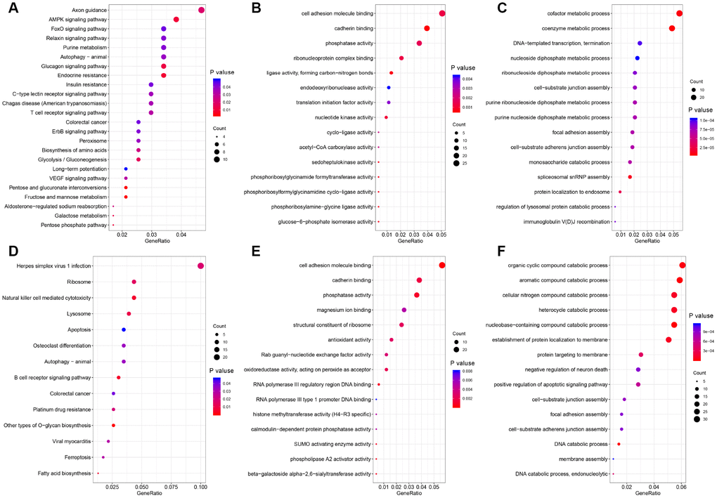 AS can directly alter protein function. To explore the potential functions and pathways of the DEAS events, we performed an enrichment analysis of the differentially spliced genes (DSGs). As shown in Figure 2A, the DEAS that were upregulated in RC were significantly enriched for genes involved in axon guidance (P=0.02), adenosine monophosphate kinase signaling (P=0.009), FoxO signaling (P=0.04), VEGF signaling (P=0.03) and colorectal cancer (P=0.04). The DEAS that were upregulated in LC were significantly enriched for genes involved in B cell receptor signaling (P=0.004), natural killer cell-mediated cytotoxicity (P=0.005), ribosomes (P=0.01) and colorectal cancer (P=0.04) (Figure 2D). Gene ontology (GO) molecular function enrichment analysis indicated that cadherin binding (P=5.4×10−3) and cell adhesion molecule binding (P=1.3×10−3) were enriched in LC and RC, respectively (Figure 2B and 2E). GO biological process enrichment analysis indicated that coenzyme metabolic processes (P=5.1×10−6), cofactor metabolic processes (P=7.7×10−6) and spliceosomal small nuclear ribonucleoprotein assembly (P=1.2×10−5) were enriched in RC, while nucleobase-containing compound catabolic processes (P=1.3×10−5) and DNA catabolic processes (P=2.4×10−5) were enriched in LC (Figure 2C and 2F).