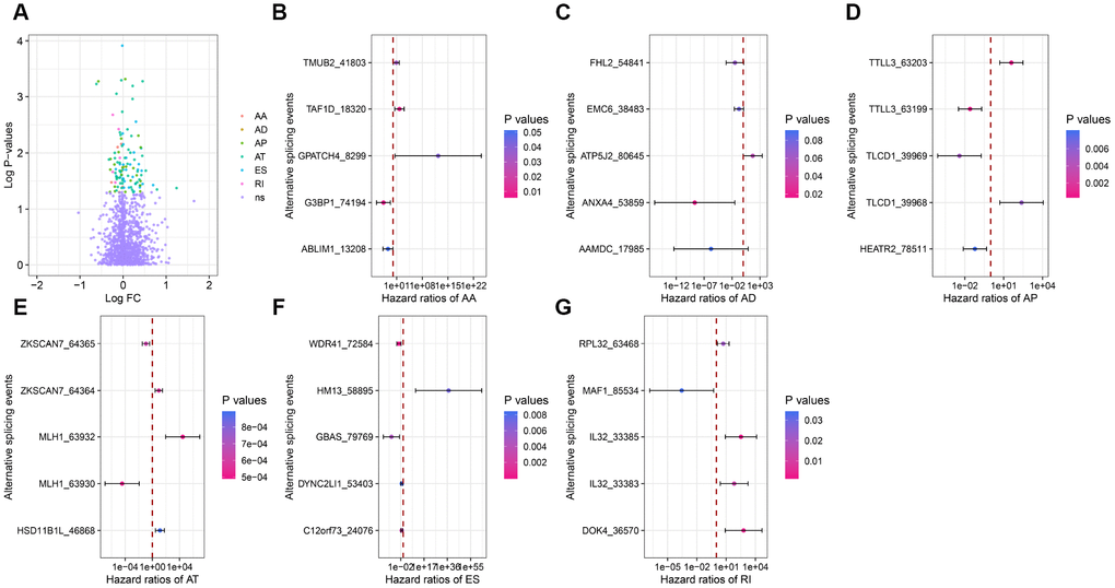 To investigate the relationship between DEAS and overall survival in colon cancer patients, we performed a univariate Cox regression analysis of the 1248 DEAS events in the 434 patients. As shown in Figure 3A, 114 survival-associated DEAS were identified (P<0.05). Six of the seven splicing patterns (all but the ME pattern) contained survival-associated DEAS. The AT pattern contained the most survival-associated DEAS (48 cases), followed by the ES pattern (31 cases). The AD pattern contained the fewest survival-associated DEAS (2 cases). For each splicing pattern, the hazard ratios of the five AS events with the smallest P-values are visualized in Figure 3B–3G.
