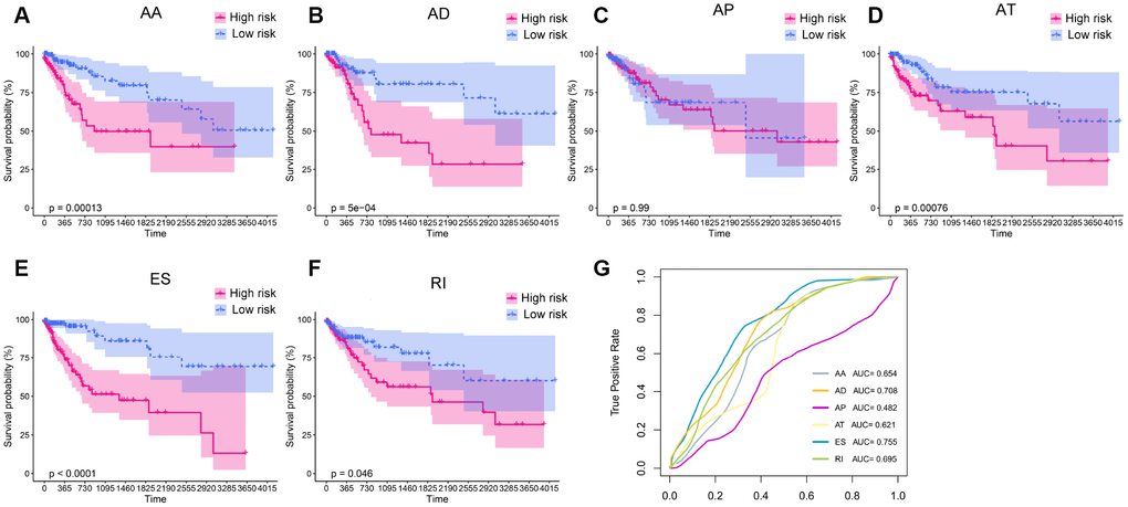 Next, we sought to identify independent prognostic DEAS in colon cancer. Since the univariate Cox regression was only a preliminary screening, we used a relatively loose filter (P-value <0.15) to select variables for multivariate Cox regression analysis. We performed separate multivariate Cox regression analyses for the six splicing patterns. The multivariate Cox regression analysis results for each pattern of AS events are shown in Figure 4A–4F. Colon cancer patients were divided into high-risk and low-risk groups according to the median risk scores predicted by the prognostic models. Five of the six prognostic models exhibited significant power to distinguish good from poor outcomes in colon cancer patients. The prognostic model based on the ES pattern was the most powerful, with a P-value <0.0001. To further assess the discriminatory abilities of these prognostic models, we generated receiver operating characteristic (ROC) curves and calculated the area under the curve (AUC) (Figure 4G). The prognostic model based on the ES pattern displayed the greatest discriminatory ability, with an AUC of 0.755.