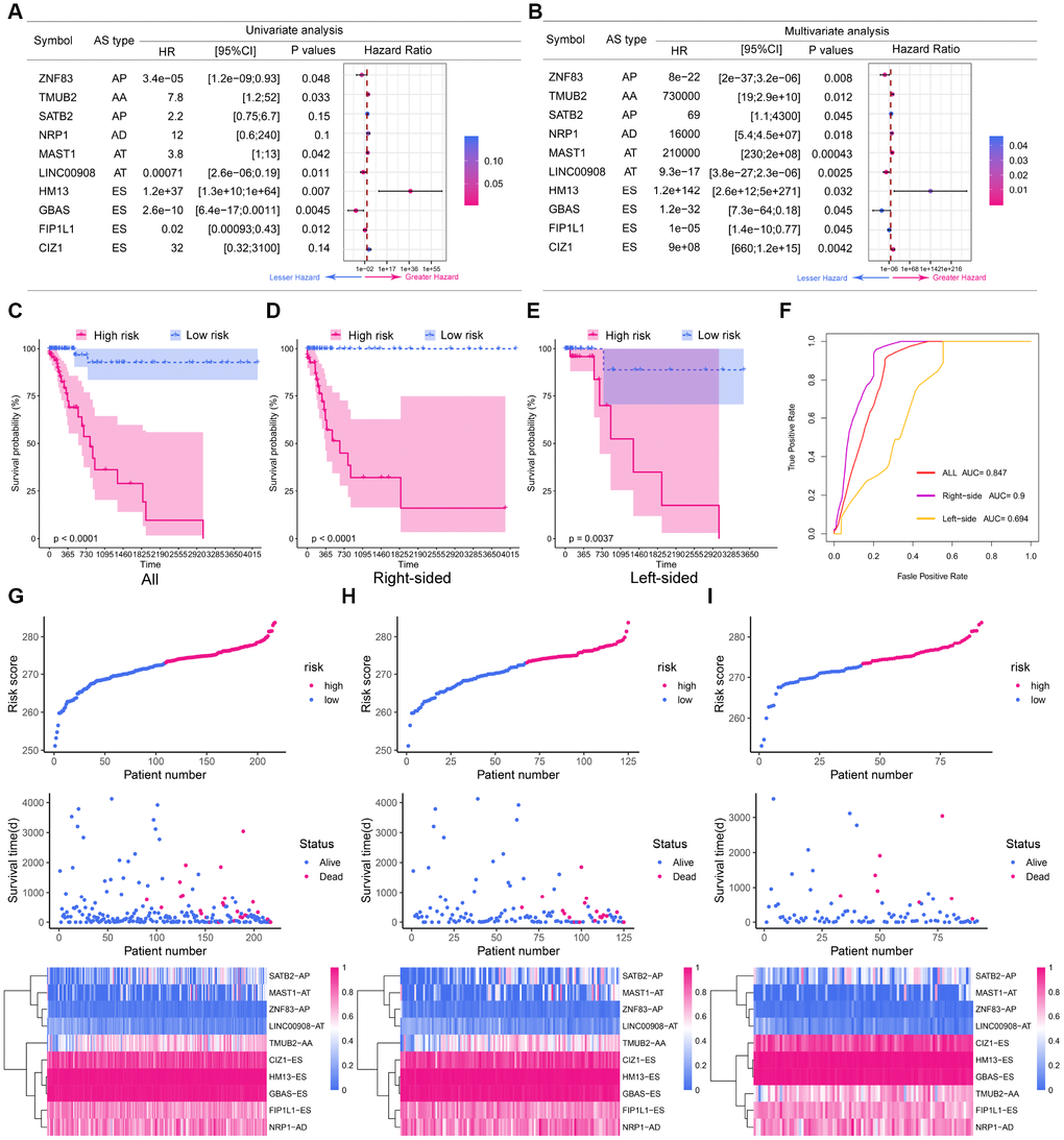 To evaluate whether specific DEAS could be used as indicators of colon cancer prognosis, we built prognostic models based on individual AS patterns. The ES pattern was the most efficient in predicting the survival outcomes of colon cancer patients. By combining the different AS patterns, we were able to construct an ideal prognostic model. The final prognostic model included 10 prognostic factors: ZNF83-AP, TMUB2-AA, SATB2-AP, NRP1-AD, MAST1-AT, LINC00908-AT, HM13-ES, GBAS-ES, FIP1L1-ES and CIZ1-ES.