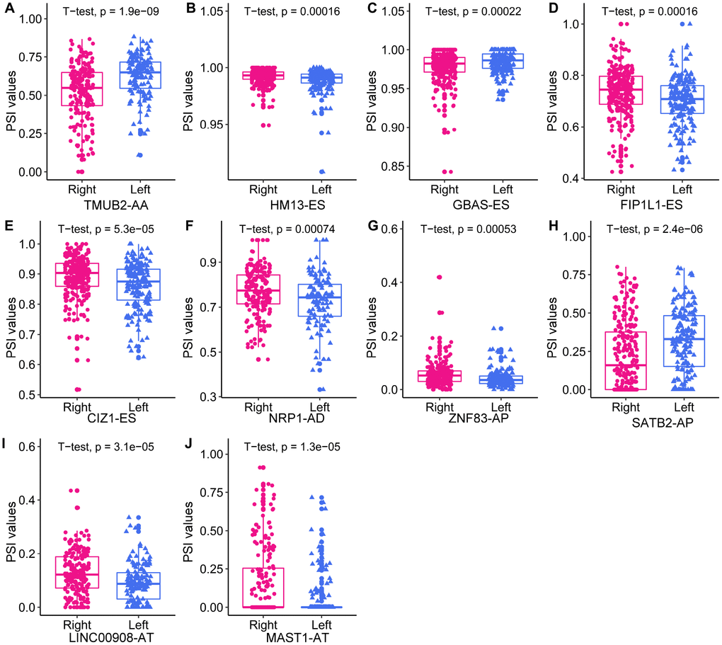 Several studies have identified cancer-specific AS events by comparing cancer patients with normal controls [29–31]. In CRC, 421 differentially expressed AS events (DEAS) were found, and the parent genes were enriched in protein kinase activity, phosphoinositide 3-kinase/Akt signaling and P53 signaling pathways [31]. However, to the best of our knowledge, the AS events and SFs in LC and RC have not been systematically compared, although such a comparison is greatly needed in view of the heterogeneity of colon cancer. To fill this gap, we systematically profiled the distinct AS events and SFs between LC and RC and built an interaction network from them. We also identified a series of distinct prognostic AS events and used them to construct a highly efficient prognostic signature.