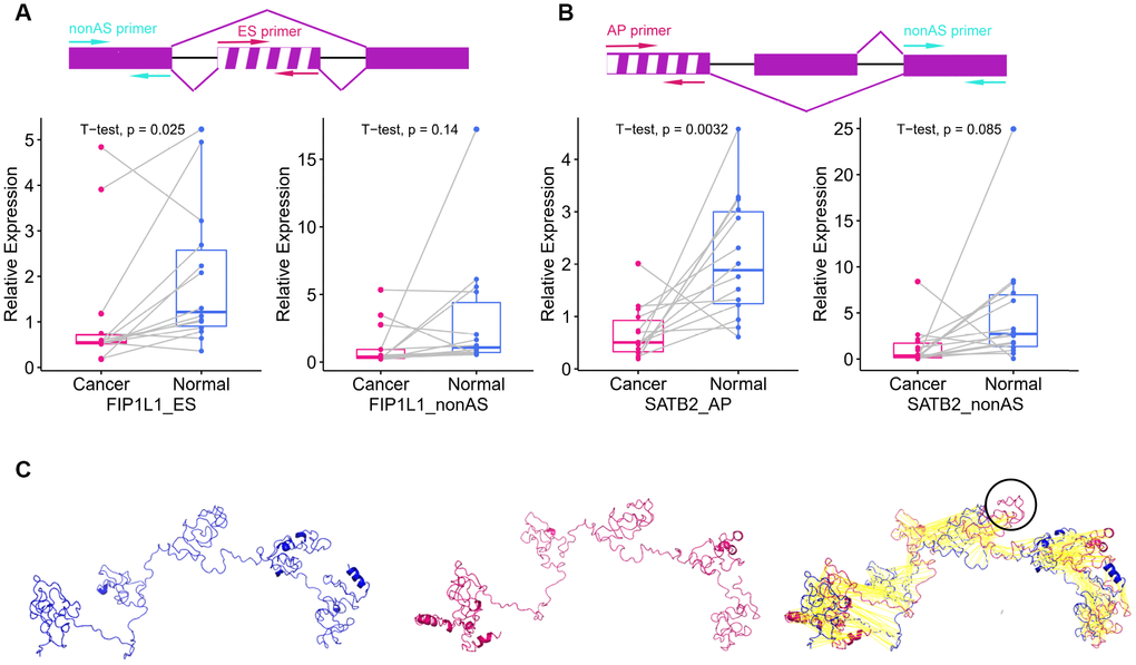 Different isoforms of mRNA can be translated into proteins with different structures, thus increasing the diversity of the proteome and the complexity of cells. Therefore, we explored the effects of AS on protein structures. The AP of SATB2 is located in the 5′ untranslated region, where it can influence the translation process, but not the protein structure. Thus, we only used the ES of FIP1L1 as an example. The ES of FIP1L1 occurred in the 11th exon and resulted in two isoforms of FIP1L1. The longer variant could be translated into a sequence of 588 amino acids, while the shorter variant could be translated into a sequence of 552 amino acids. The predicated three-dimensional structures of the two variants are shown in Figure 7C. The shorter variant lacked a structure that could have altered the protein functional domain and protein-protein interactions.