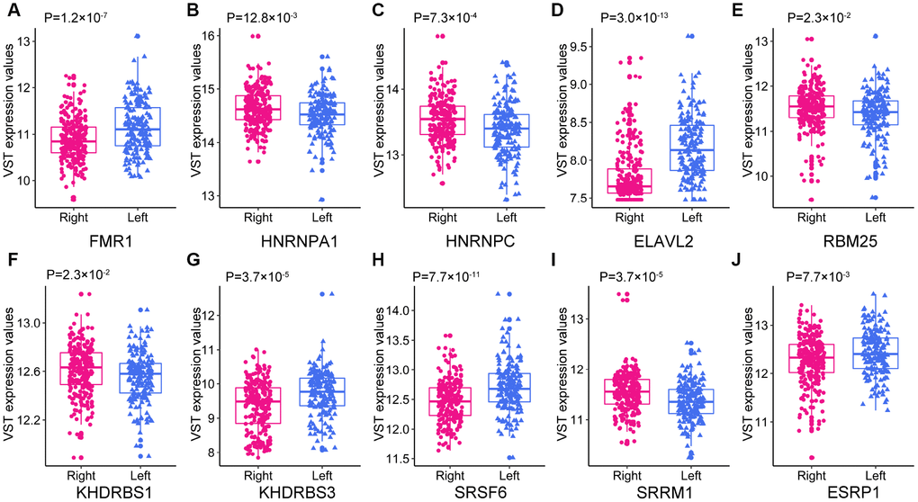 First, we identified differentially expressed SFs (DESFs) in LC and RC. The mRNA levels of 71 experimentally validated SFs were obtained and used for differential expression analysis. We identified 10 DESFs in LC and RC. As shown in Figure 8, five SFs were upregulated in RC and five SFs were upregulated in LC. ELAVL2 exhibited the most significant difference in expression between RC and LC.