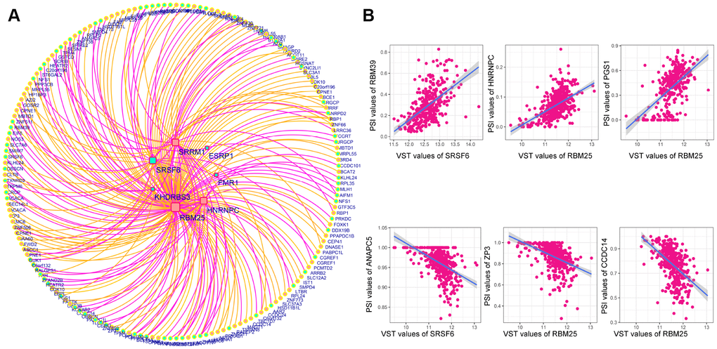 Next, we analyzed the correlations between the DESFs and DEAS events, and constructed a correlation network from the significantly related pairs (|R| > 0.4 and adjusted P-value <0.05). As shown in Figure 9A, 218 DEAS events were significantly associated with 7 DESFs. Among the 218 DEAS events, 119 were upregulated in RC (orange dots) and 99 were upregulated in LC (green dots). RBM25 was a hub SF in the correlation network, and was significantly associated with 121 of the 218 DEAS, indicating that it was a key determinant of the distinct AS events in LC and RC. Representative correlations between DESFs and DEAS events are presented as dot plots (Figure 9B). For example, SRSF6 expression correlated positively with RBM39 expression, suggesting that RBM39 could be a potential target of SRSF6.