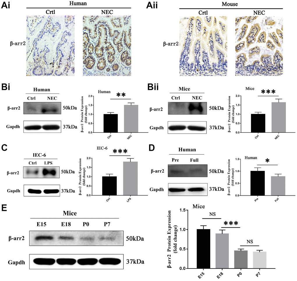 To investigate the potential involvement of β-arrestin-2 in the pathogenesis of NEC, we first analyzed β-arrestin-2 expression in neonatal intestinal tissues from humans and mice. The demographic and clinical characteristics of the NEC patients and control patients are shown in Supplementary Table 1. Immunohistochemical staining revealed that β-arrestin-2 was expressed in neonatal intestinal tissues, and was upregulated in both humans (Figure 1Ai) and mice (Figure 1Aii) with NEC compared with healthy controls. Western blotting also revealed that β-arrestin-2 protein expression was upregulated in intestinal samples from humans (Figure 1Bi) and mice (Figure 1Bii) with NEC (P < 0.05). Furthermore, β-arrestin-2 expression was markedly greater in lipopolysaccharide (LPS)-treated IEC-6 cells than in control cells (Figure 1C).