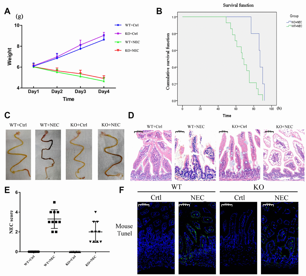To determine whether β-arrestin-2 promotes the development of NEC, we experimentally induced NEC in β-arrestin-2 knockout (KO) and wide-type (WT) mice, and compared the mice with the corresponding controls (Ctrl). Body weights were recorded for all four groups (WT+Ctrl, WT+NEC, KO+Ctrl, KO+NEC), and although both of the NEC groups lost weight, the body weight decline was slower in the KO+NEC group than in the WT+NEC group (Figure 2A). The survival rates of the NEC groups also were examined. Death events began on experimental day 3 in the WT+NEC group and continued to occur rapidly thereafter. By the end point, only 30% of mice in the WT+NEC group had survived, while 75% of mice in the KO+NEC group had survived (Figure 2B). Thus, significantly better survival was observed in the KO+NEC group.