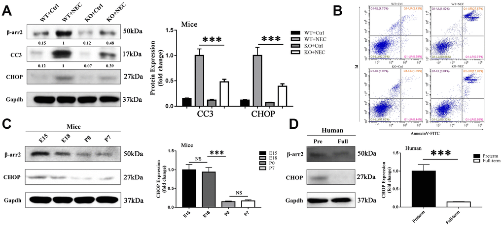 The mechanism of intestinal mucosal cell apoptosis in NEC is still poorly understood, but ER stress may be a leading contributor. The expression of CCAAT-enhancer-binding protein homologous protein (CHOP), a transcription factor in the ER stress response, was upregulated in both NEC groups. However, like CC3, CHOP was not equally induced in the two NEC groups; CHOP expression was 2.5-fold greater in the WT+NEC group than in the KO+NEC group (Figure 3A). Furthermore, CHOP expression was greater in preterm mice (Figure 3C) and infants (Figure 3D) than in full-term ones. Hence, β-arrestin-2 expression appeared to correlate with CHOP and CC3 expression. These results suggested that β-arrestin-2 may induce NEC by stimulating ER-stress-induced apoptosis.