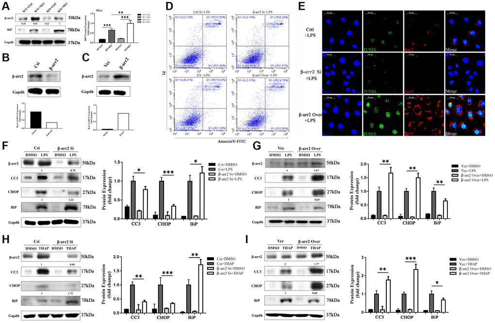LPS treatment induced the expression of the apoptotic marker CC3 and the ER stress markers CHOP and BiP in IEC-6 cells (Figure 4F, 4G). Treatment with β-arrestin-2 siRNA attenuated the LPS-induced increases in CC3 and CHOP expression, but augmented the increase in BiP expression (Figure 4F). On the other hand, overexpression of β-arrestin-2 enhanced the LPS-induced increases in CC3 and CHOP expression, but dampened the increase in BiP expression (Figure 4G). Similar results were observed when the same cell lines were pretreated with thapsigargin (a positive control for ER stress) rather than LPS (Figure 4H, 4I). These results suggested that BiP is an important downstream protein that links β-arrestin-2 with ER-stress-associated apoptosis.