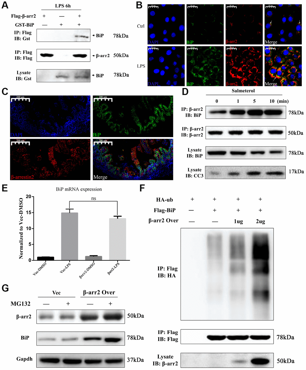 Intriguingly, in LPS-stimulated cells, we found that the overexpression of β-arrestin-2 did not influence BiP mRNA expression (Figure 6E), even though it had significantly downregulated BiP protein expression (Figure 4G). This inconsistency suggested that β-arrestin-2 might downregulate BiP by promoting its post-translational modification and subsequent degradation. β-arrestins are known to induce protein degradation through ubiquitination, and BiP has been reported to be downregulated by ubiquitination [11, 20]. Thus, we examined the ubiquitination of BiP in LPS-stimulated cells that ectopically expressed β-arrestin-2. We found that β-arrestin-2 increased the ubiquitination of BiP in a dose-dependent manner (Figure 6F). Furthermore, the ubiquitin-proteasome inhibitor MG132 increased BiP protein levels in β-arrestin-2-overexpressing cells, suggesting that the ubiquitin-proteasome pathway was involved in the degradation of BiP (Figure 6G). These results suggested that β-arrestin-2 may bind to BiP and promote its degradation via ubiquitination.
