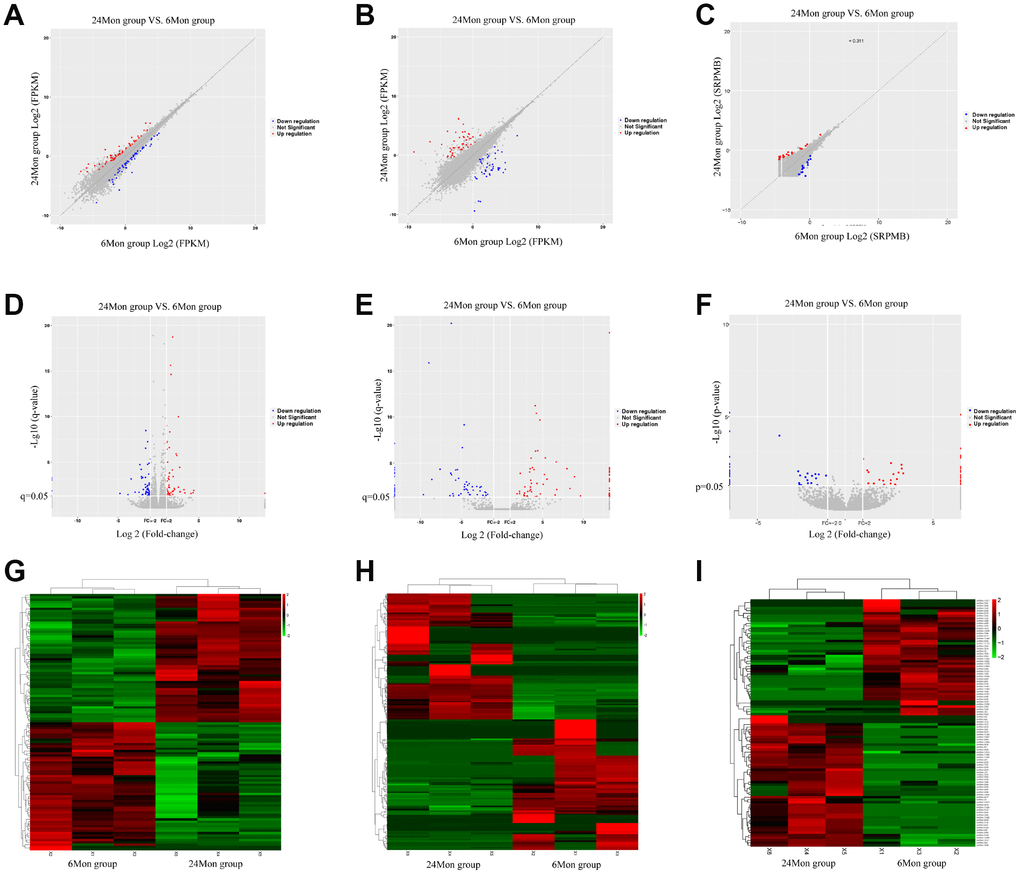 A total of 112 DEMs (Supplementary Table 1), 163 DELs (Supplementary Table 2), and 98 DECs (Supplementary Table 3) were found in the SN of 24-month old (24Mon) rats comparted to six-month old (6Mon) rats. Of these, 56 DEMs (50.0% of all DEMs), 80 DELs (49.1% of all DELs), and 52 DECs (53.1% of all DECs) were up-regulated, while 56 DEMs (50.0%), 83 DELs (50.9%), and 46 DECs (46.9%) were down-regulated, in the SN of 24Mon rats. Scatter diagrams (A-C), volcano diagrams (D-F), and hierarchical clustering analysis (G-I) showing differences in SN mRNA, lncRNA, and circRNA expression between 24Mon and 6Mon rats are shown in Figure 1. The ten DEMs for which expression changed the most in the SN of 24Mon rats compared to 6Mon rats are listed in Table 1.
