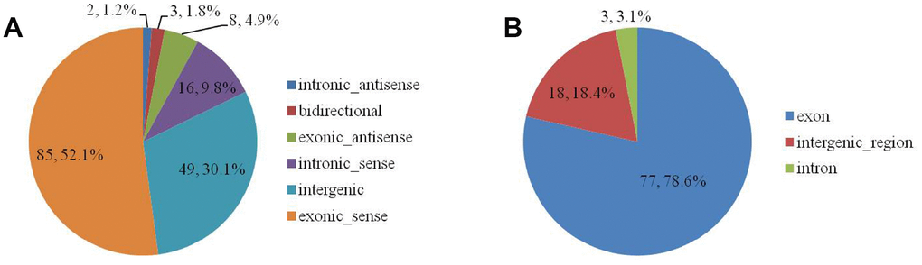 The 163 DELs were divided among six biotype categories: three (1.8%) were bidirectional, eight (4.9%) were exonic-antisense, 85 (52.1%) were exonic-sense, 49 (30.1%) were intergenic, two (1.2%) were intronic-antisense, and 16 (9.8%) were intronic-sense (Supplementary Table 4 and Figure 2A). The 98 DECs were divided among three categories: 77 (78.6%) were exon, 18 (18.4%) were intergenic-region, and three (3.1%) were intron (Supplementary Table 5 and Figure 2B).
