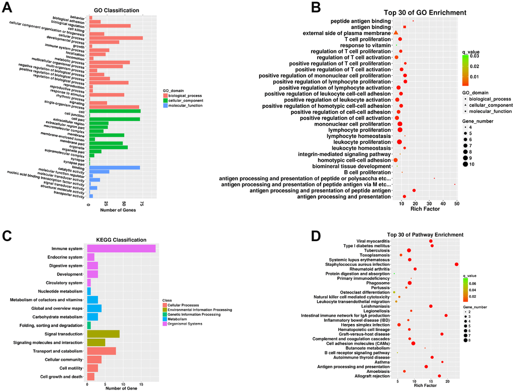 A total of 112 DEMs were obviously responsive to 23 biological processes (BP), 14 cellular components (CC), and eight molecular functions (MF) in the SN of 24Mon rats (Figure 3A and Supplementary Table 6). These DEMs were associated with 290 functional enrichments (Supplementary Table 7). The top 30 GO enrichments are shown in Figure 3B. KEGG classifications indicated that these DEMs were responsive to four cellular processes and to two environmental information processing, one genetic information processing, four metabolism, and five organismal systems (Figure 3C and Supplementary Table 8). The DEMs were significantly enriched in 77 KEGG pathways (Supplementary Table 9). The top 30 KEGG pathway enrichments are shown in Figure 3D.