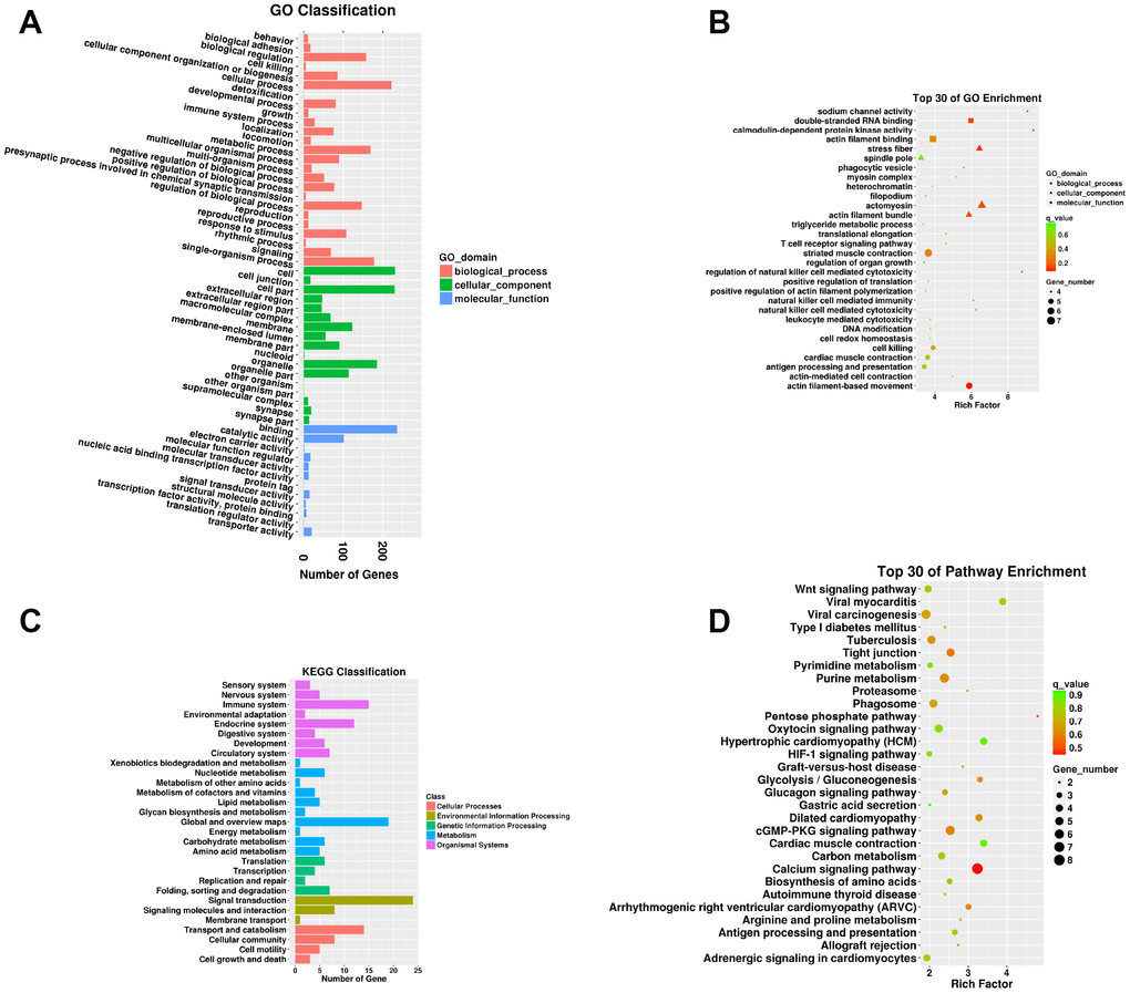 To better understand the biological functions and potential regulatory roles of dysregulated mRNAs, lncRNAs, and circRNAs, we performed GO (http://geneontology.org) and KEGG (https://www. kegg.jp) pathway and enrichment analysis. GO analysis involved classifying associations between DEMs, mRNAs targeted by DELs, and parental mRNAs of DECs and the following three categories: biological process (BP), cellular component (CC), and molecular function (MF). GO terms were widely used as functional enrichment analysis for many genes. KEGG pathway analysis included classifications and pathway enrichment analysis. A q-value < 0.05 denoted significant enrichments in the GO and KEGG pathways.