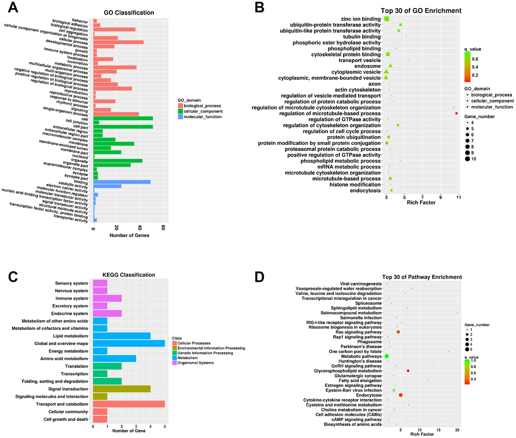 A total of 737 targeting relationships were identified between DELs and mRNAs (Supplementary Table 10). The mRNAs targeted by DELs were obviously responsive to 25 BPs, 17 CCs, and 12 MFs in the SN of 24Mon rats (Figure 4A and Supplementary Table 11) and were associated with 858 functional enrichments (Supplementary Table 12). The top 30 GO enrichments are shown in Figure 4B. KEGG classifications indicated that the mRNAs targeted by DELs were responsive to four cellular processes and to three environmental information processing, four genetic information processing, ten metabolism, and eight organismal systems (Figure 4C and Supplementary Table 13). The mRNAs targeted by DELs were significantly enriched in 170 KEGG pathways (Supplementary Table 14). The top 30 KEGG pathway enrichments are shown in Figure 4D.