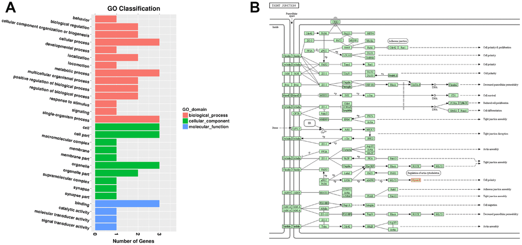 Among the 163 DELs, four (NONRATT010417.2, NONRATT015586.2, NONRATT000490.2, and NONRATT007029.2) targeted three DEMs (Myh1, Casr, and Mis18a) (Table 2). None of the parental mRNAs of the 98 DECs were differentially expressed. In the SN of 24Mon rats, down-regulated lncRNA NONRATT010417.2 targeted the down-regulated mRNA Myh1 (ENSRNOG00000049695), while the down-regulated lncRNA NONRATT015586.2 and the up-regulated lncRNAs NONRATT000490.2 and NONRATT007029.2 targeted the down-regulated mRNAs Casr (ENSRNOG00000002265) and Mis18a (ENSRNOG00000021555) (Table 2). GO analysis indicated that these three DEMs (Myh1, Casr, and Mis18a) were obviously responsive to 14 BPs, ten CCs, and four MFs in the SN of 24Mon rats (Figure 6A and Supplementary Table 20) and were not significantly associated with any GO functional enrichments. KEGG pathway analysis revealed that Myh1 is responsive to cellular processes and significantly enriched in the tight junction (rno04530). Myh1 was related to cell polarity (Figure 6B). Casr and Mis18a were neither responsive to any categories nor enriched in any pathways in the KEGG analysis.