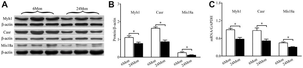 Myh1, Casr, and Mis18a protein and mRNA expression in the SN of 6Mon and 24Mon rats