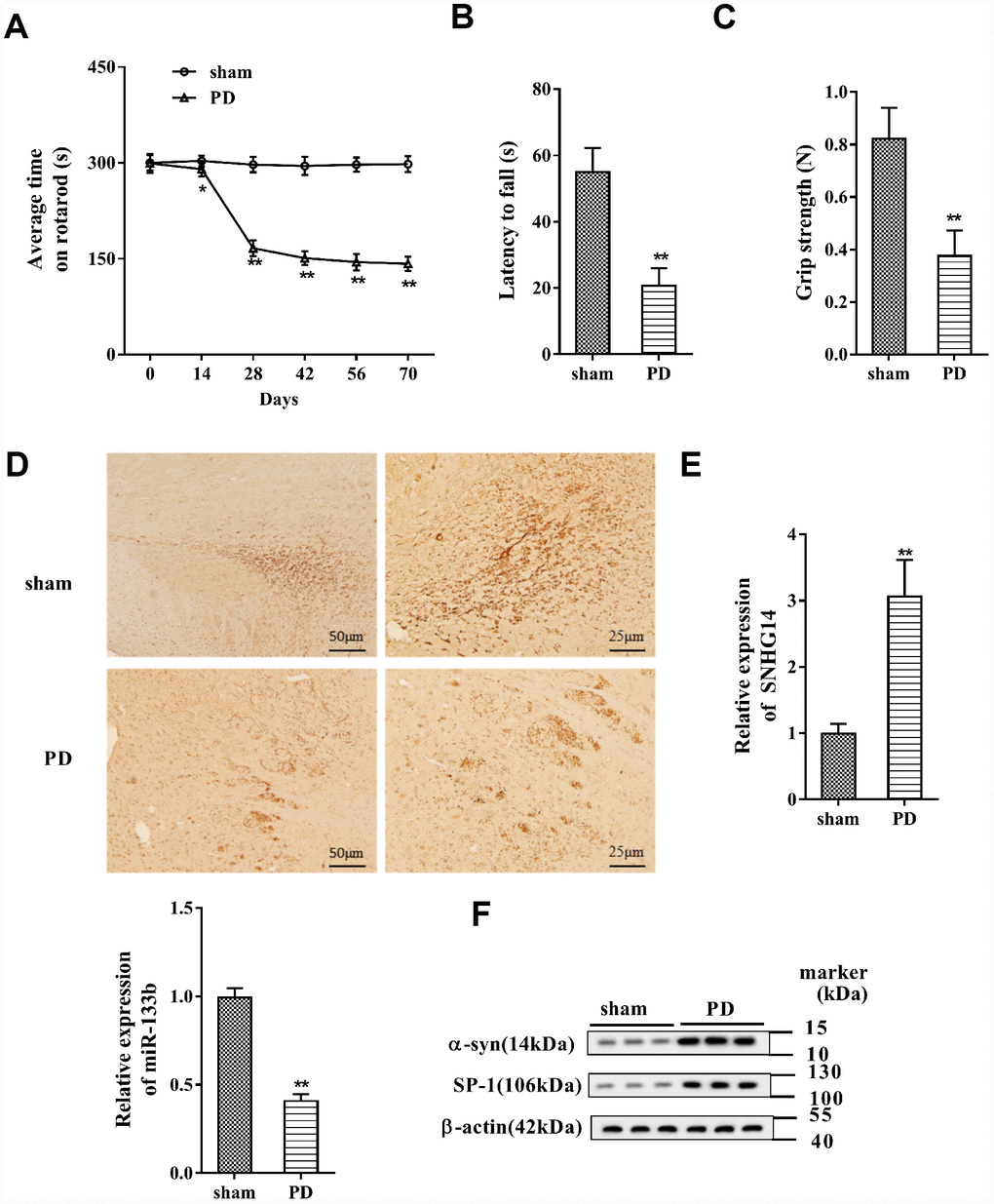 PD mice were established as previously described [20], and the rotarod performance, inverted screen test, and forelimb grip strength test were performed. The results indicated that the average time on rotarod was dramatically shortened in PD mice (n=7) than that in the sham group (n=7) (Figure 1A), and the muscle strength of PD mice was significantly damaged (Figure 1B). In addition, the grip strength was clearly reduced in PD mice compared with that in the sham group (Figure 1C). In immunohistochemistry staining of brain tissues, the DA neuron was clearly reduced in PD mice, implying the significant DA neuron loss (Figure 1D). These data proved the pathological features of PD in the mouse model. In the brain tissue, the expression of SNHG14 was markedly elevated in PD mice when comparing to the sham group, while miR-133b was notably down-regulated (Figure 1E). What’s more, compared with the sham group, the α-syn and SP-1 protein levels were remarkably up-regulated in the brain tissue of PD mice (Figure 1F). These data showed that the expression of SNHG14 was elevated in both PD patients and PD mice.
